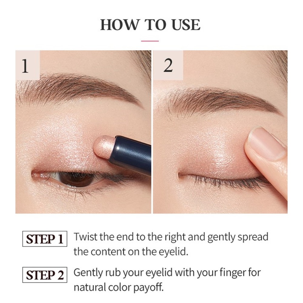 1. Twist the end to the right and gently spread the content on the eyelid. 2.Gently rub your eyelid with your finger for natural color payoff