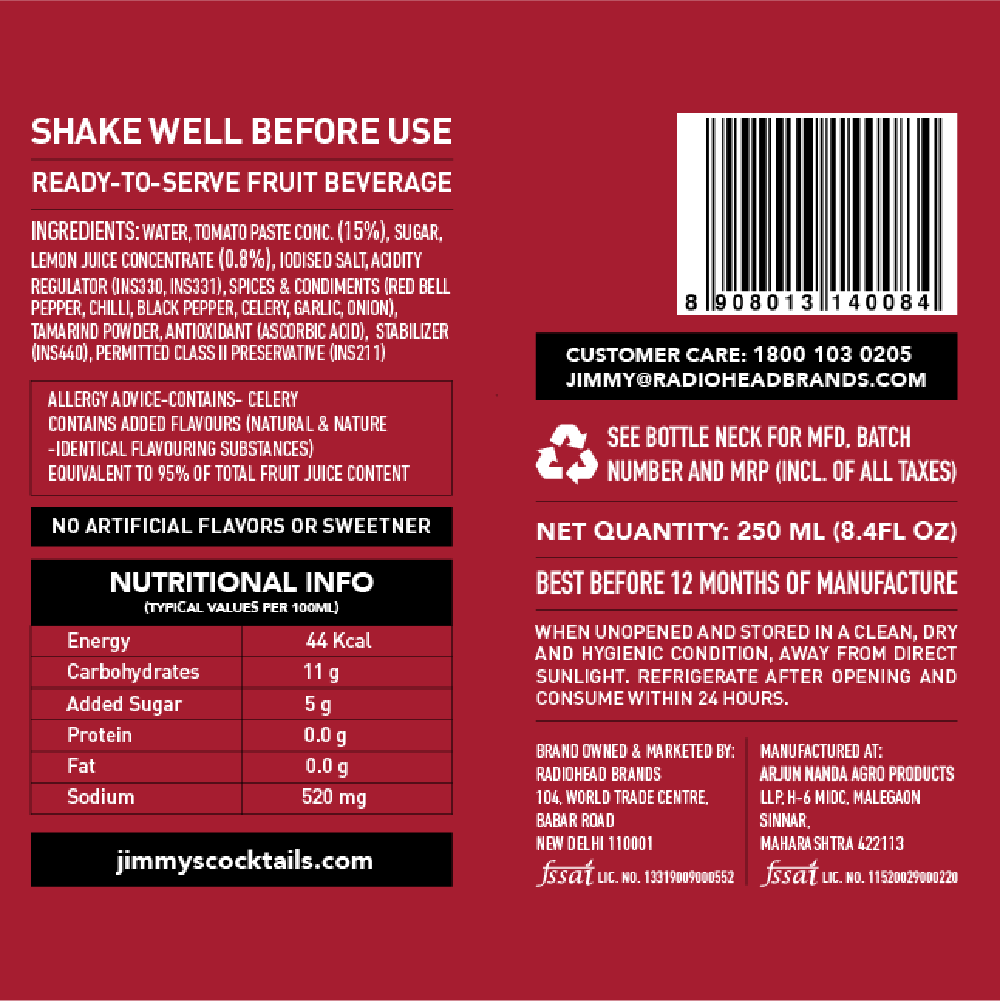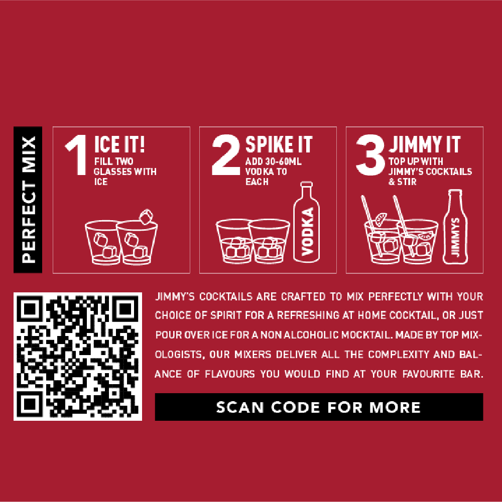 Jimmys Bloody Mary is a delicious twist on the original Bloody Mary recipe, featuring scratch Worcestershire sauce. Crafted with extra thick tomato juice, three kinds of peppers, celery, salt, lemon juice and our special hot sauce.