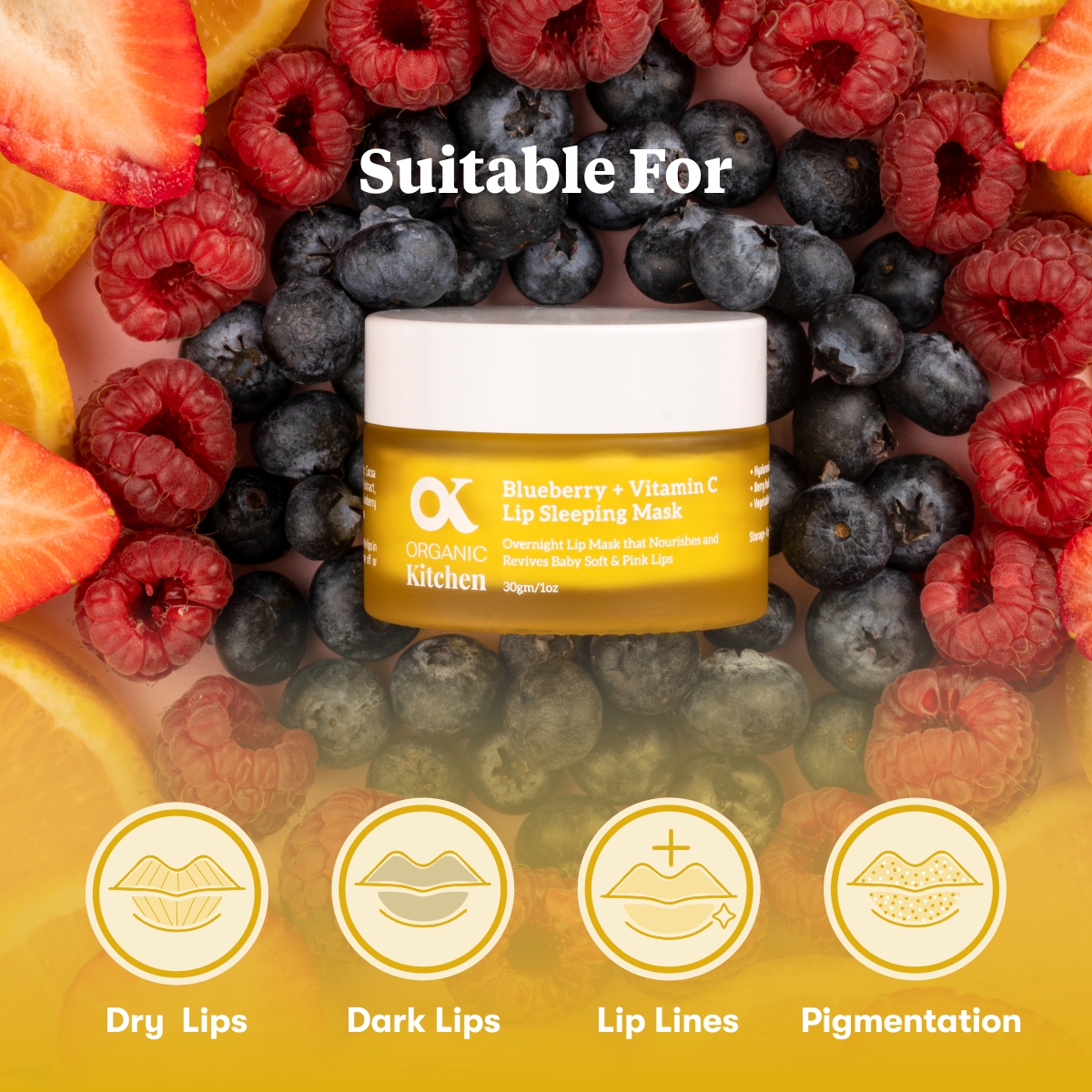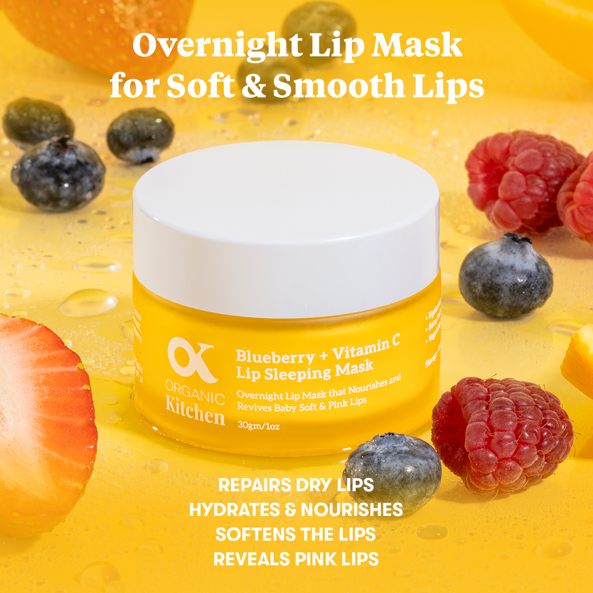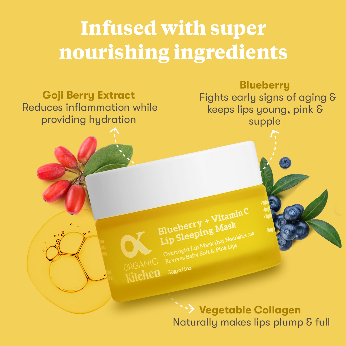 Organic Kitchen Blueberry + Vitamin C Lip Sleeping Mask is all you need to get soft and smooth lips with the goodness of natural ingredients. Containing Blueberry extract, Vegetable collagen, Goji berry, and Hyaluronic acid, it reduces lip darkening and treats dry and chapped lips. Rich in Vitamin C, Blueberry, and Goji berry help in reducing pigmentation, and vegetable collagen aid in minimizing fine lines. It also contains Shea and Cocoa butter which are high in antioxidants and give your lips a smooth and plump appearance.