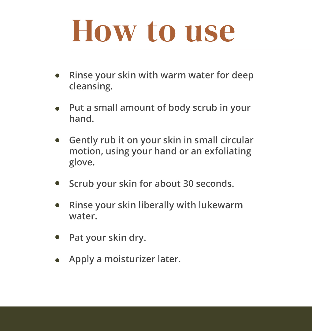 • Rinse your skin with warm water for deep cleansing. • Put a small amount of body scrub in your hand. • Gently rub it on your skin in small circular motion, using your hand or an exfoliating glove. • Scrub your skin for about 30 seconds. • Rinse your ski