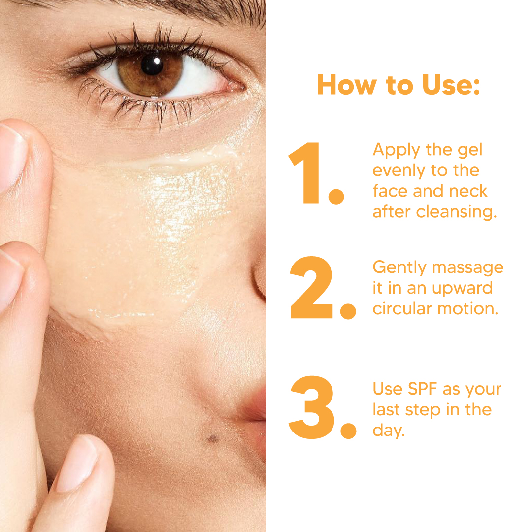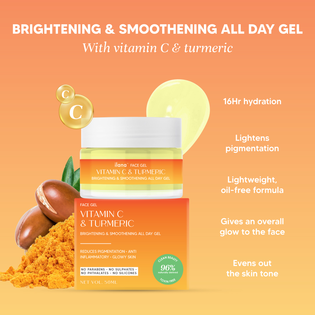 All all day, effective solution for bright and glowy hydrated skin! Enriched with 2% Vitamin C in its most stable form and turmeric this light weight, quick absorbing gel works to reduce pigmentation, lighten blemishes and dark spots and helps get calm, dewy skin. Suitable for all skin types.