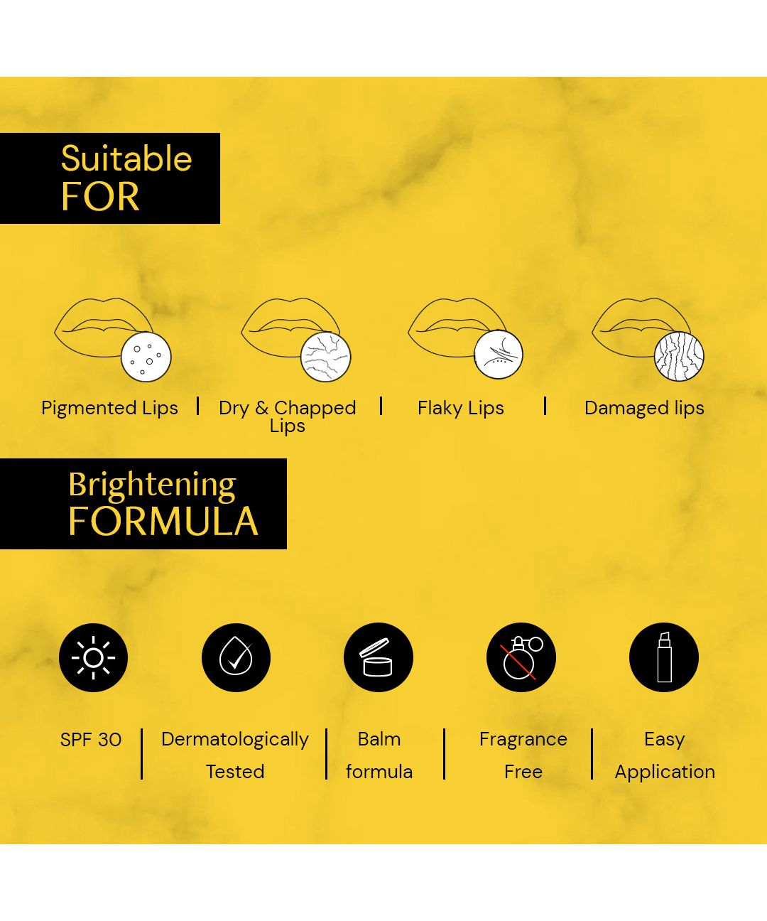 Deconstruct Brightening Lip balm with SPF 30 is formulated to nourish, target and Brightens pigmented lips and shield them from sun damage, further providing intense moisturiser to dry & chapped lips for Men & Women. The 1% Vitamin C helps repair lip discolouration, and the 0.1% Resorcinol fights against pigmentation caused by sun. The SPF 30 protects lips against harmful UV rays and brightens the lips.