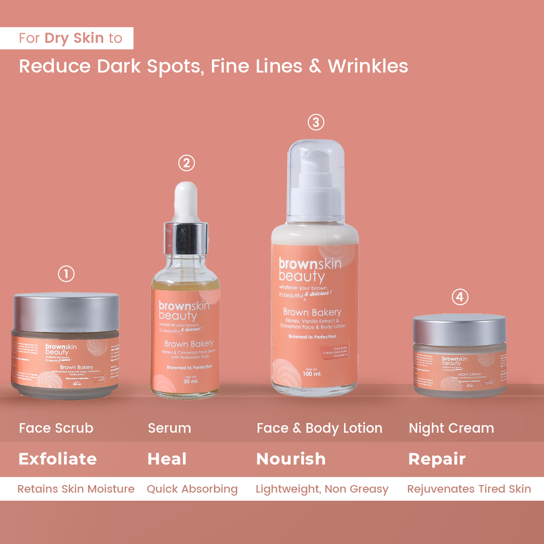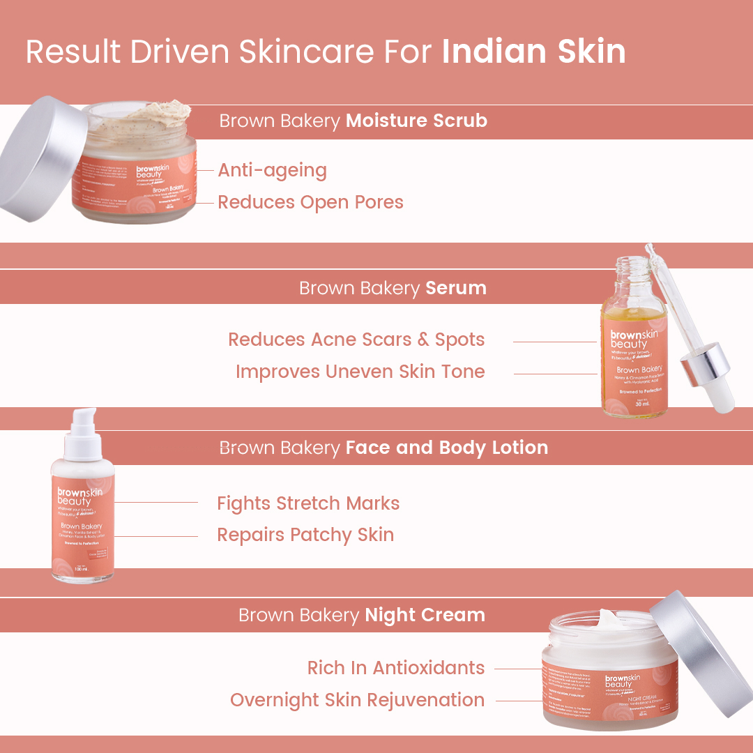 The BrownSkin Brown Bakery Skincare Set includes Brown Bakery Serum, Brown Bakery Face and Body Lotion, Brown Bakery Moisture Face Scrub, Brown Bakery Night Cream, BSB Travel Pouch. All full sizes of our bestsellers to heal, radiate and energise! Also make your gifting set is unique this holiday season with some skincare treats!