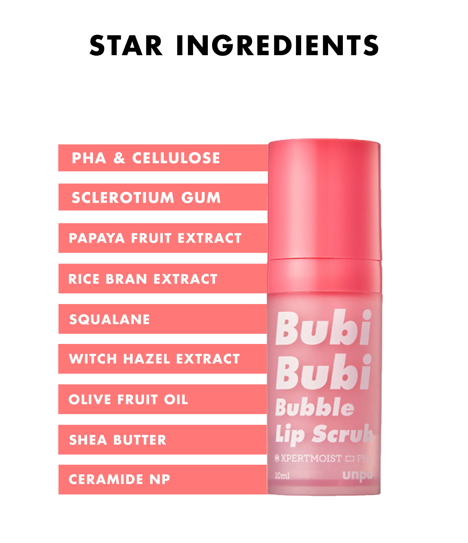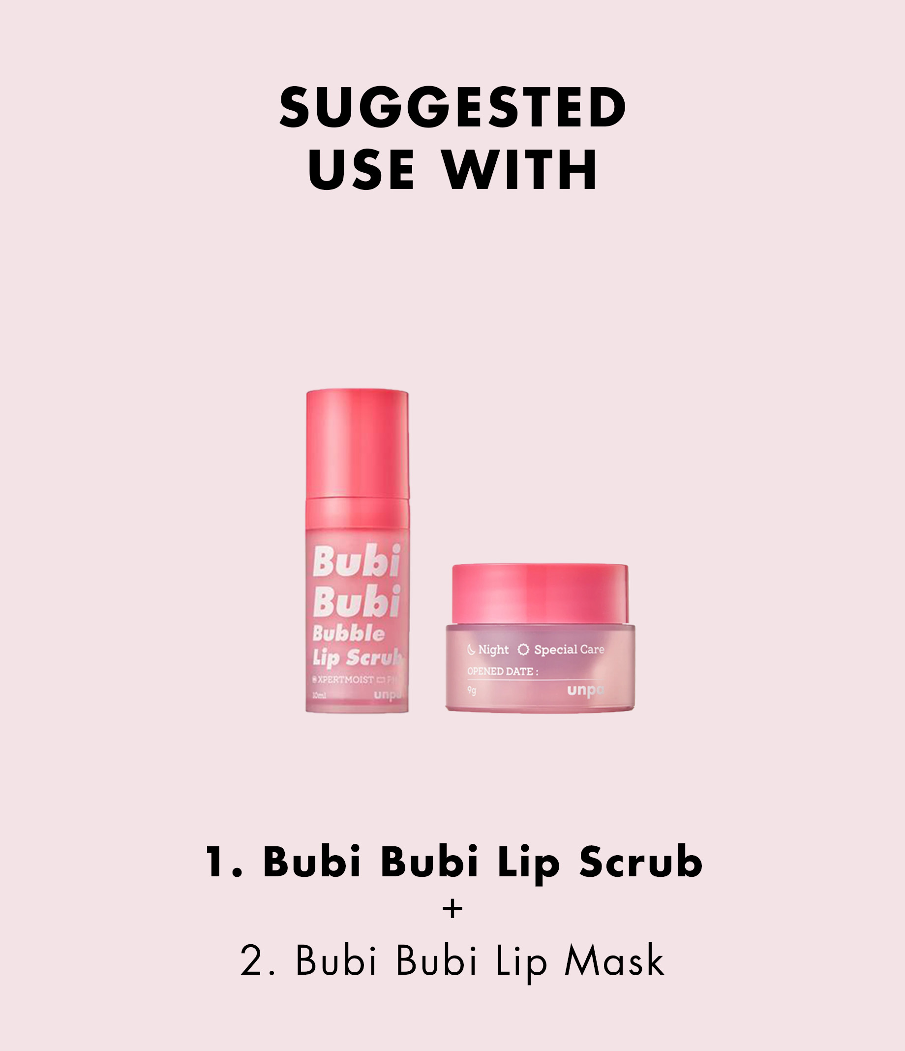 The UNPA Bubi Bubi Bubble Lip Scrub is a gentle exfoliator that removes dry, flaky skin without irritating your skin. The lip scrub also transforms its texture on application from a smooth gel, to foaming bubbles and finally a gommage that can be washed or wiped off to reveal fresh skin underneath. The bubbles that form on application provide total lip care in approximately 5 minutes, making your lip routine quick and easy!