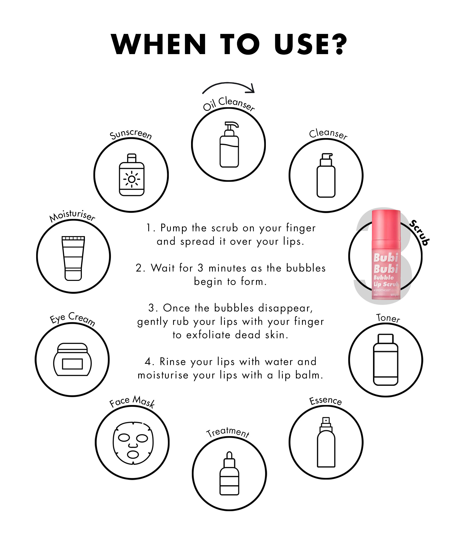 1. Pump the scrub on your finger and spread it over your lips. 2. Wait for 3 minutes as the bubbles begin to form. 3. Once the bubbles disappear, gently rub your lips with your finger to exfoliate dead skin. 4. Rinse your lips with water and moisturise yo
