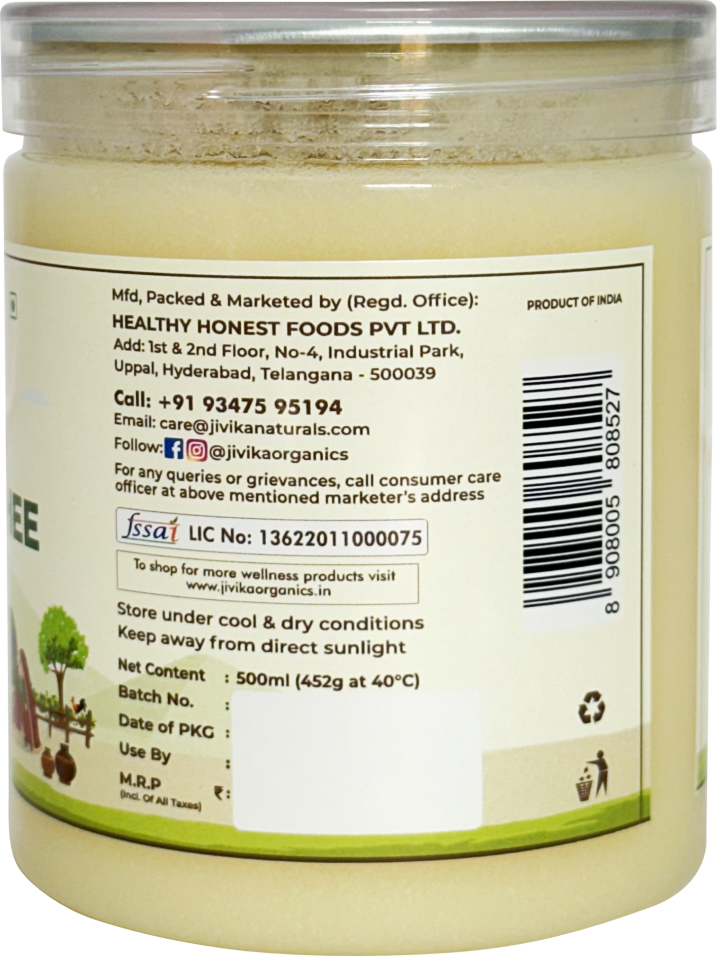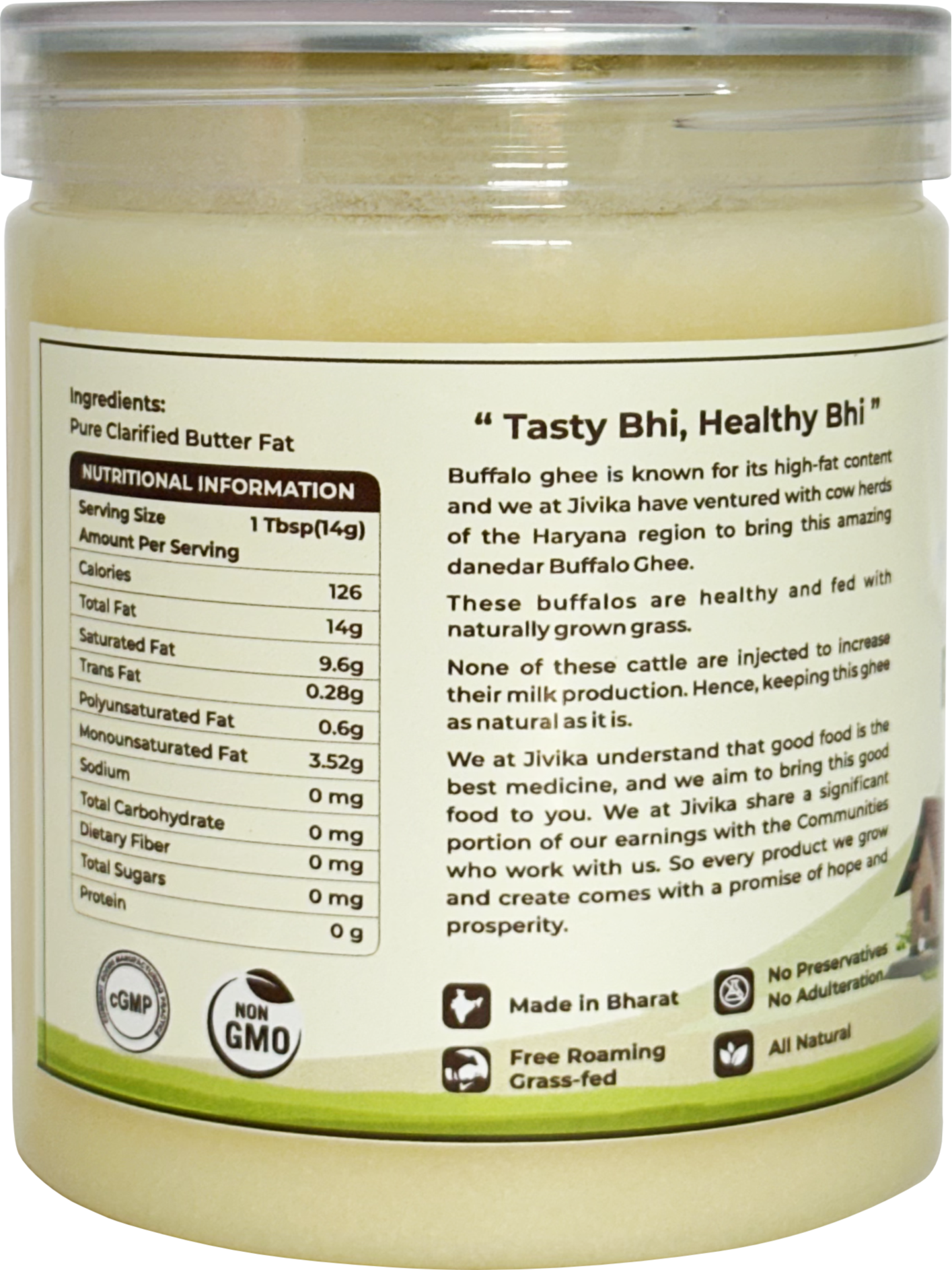 Buffalo ghee is known for its high-fat content and at Jivika we have ventured with cow herds of the Haryana region to bring this amazing danedar Buffalo Ghee.