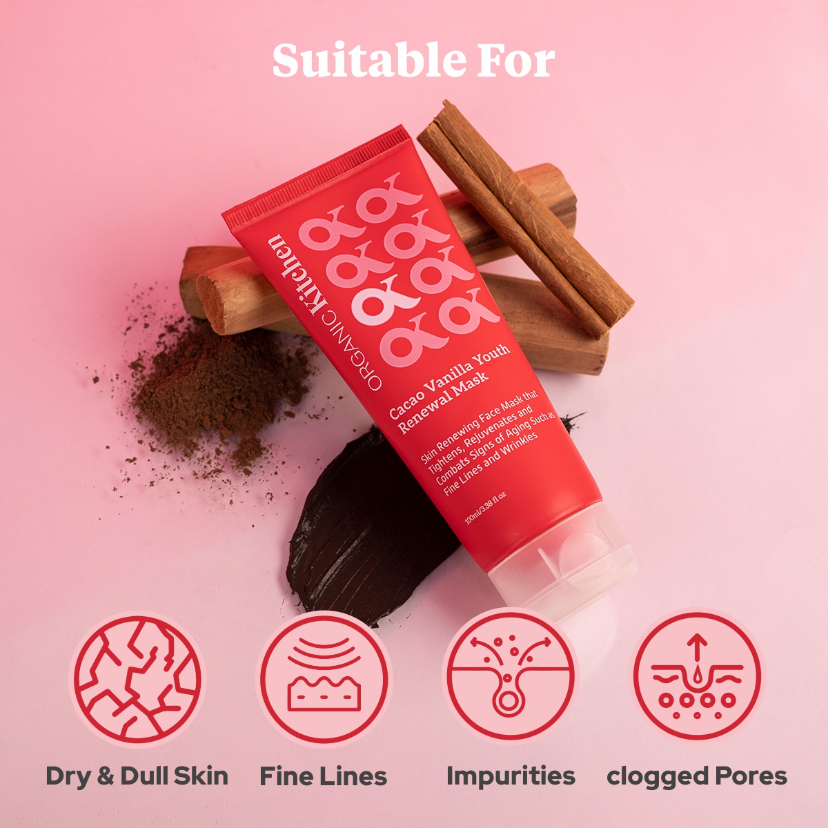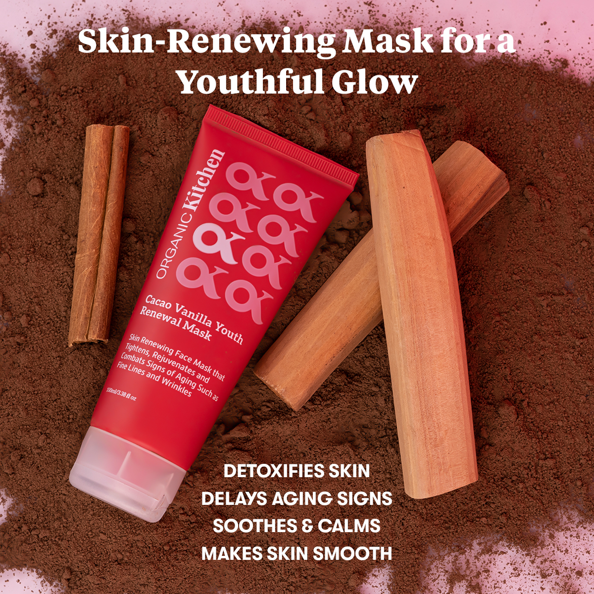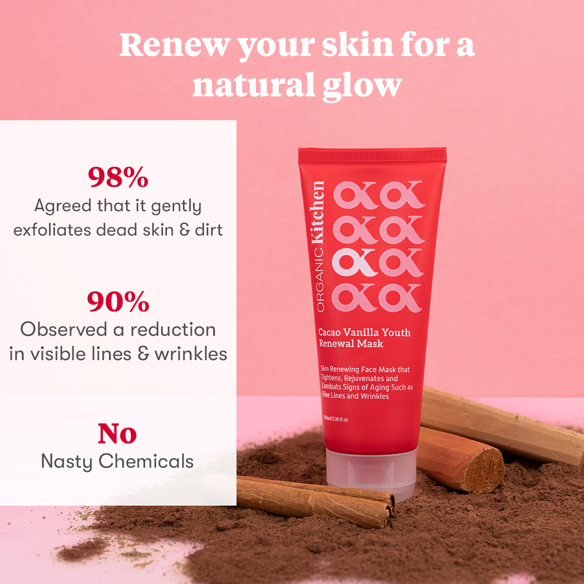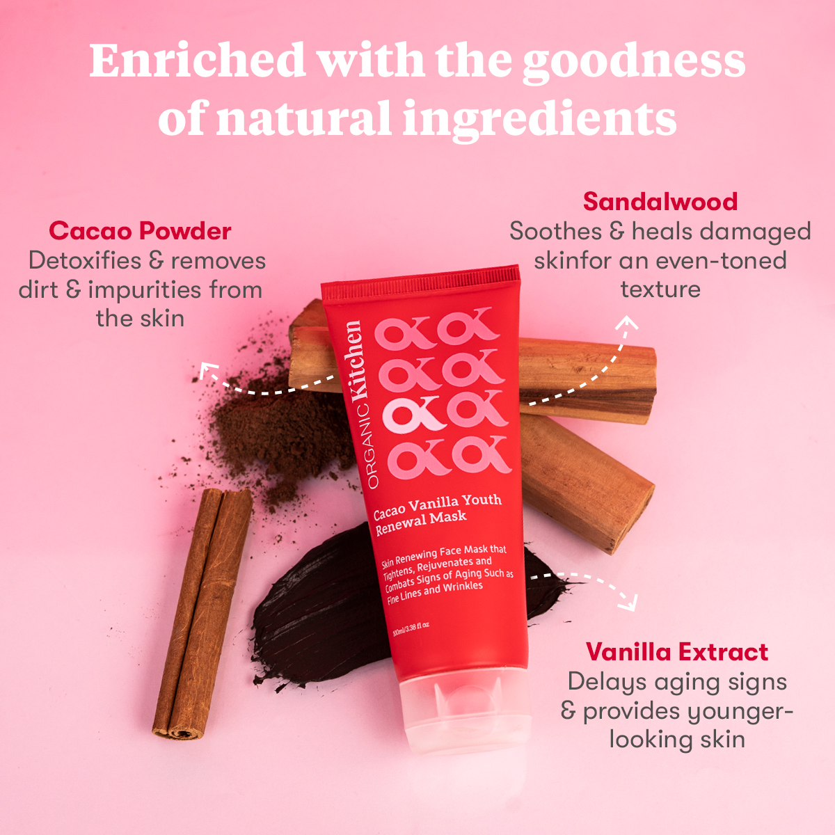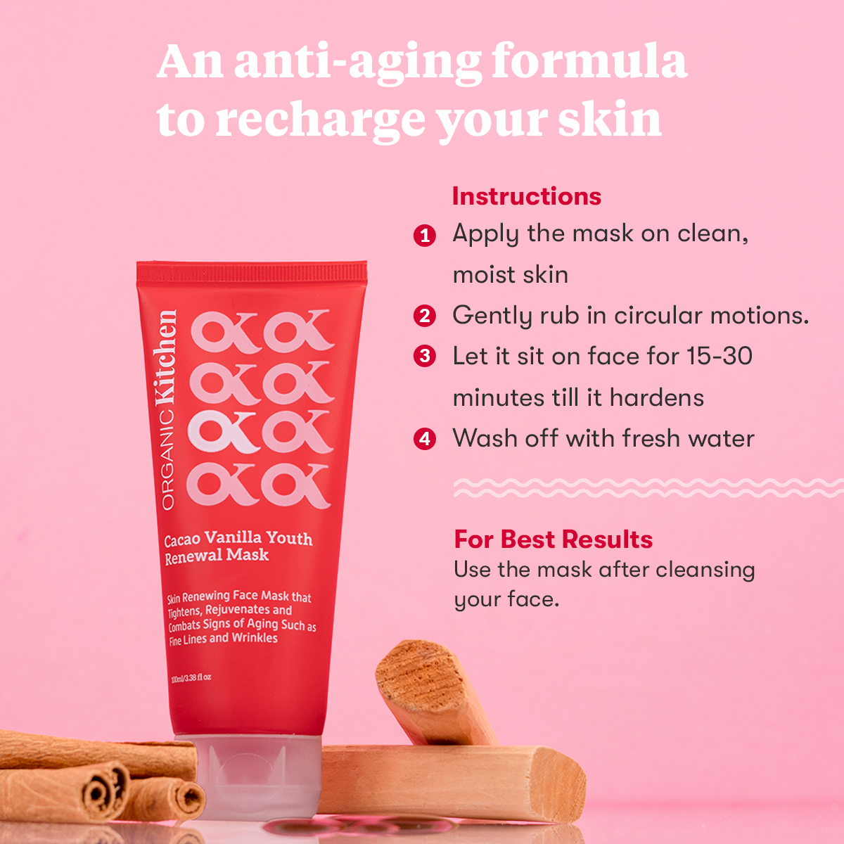 Organic Kitchen Cacao Vanilla Youth Renewal Mask is a unique formulation of cacao and vanilla, a superdose for oily and acne-prone skin. This renewal face mask helps take away excess oil from skin while treating acne. This youth renewal mask is completely free from nasty chemicals and preservatives. This is an effective solution for treating various skin conditions while lightening blemishes and makes skin cells stronger.