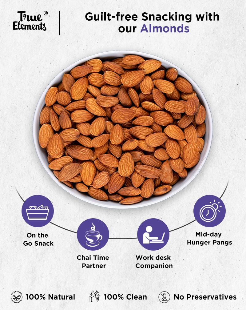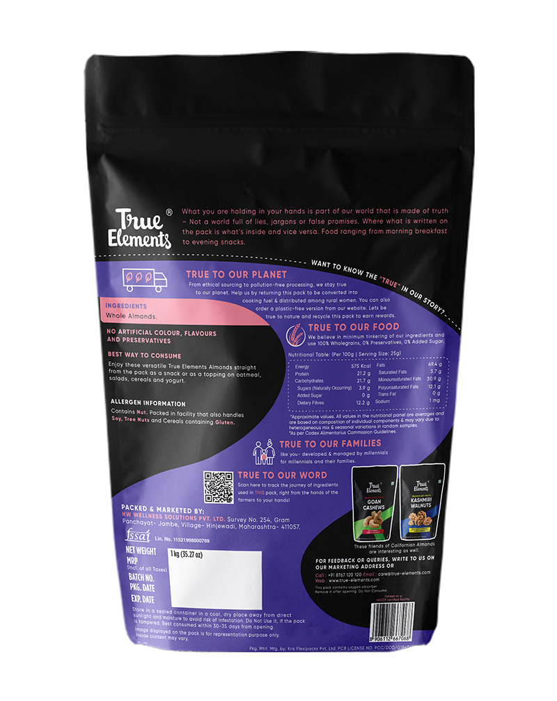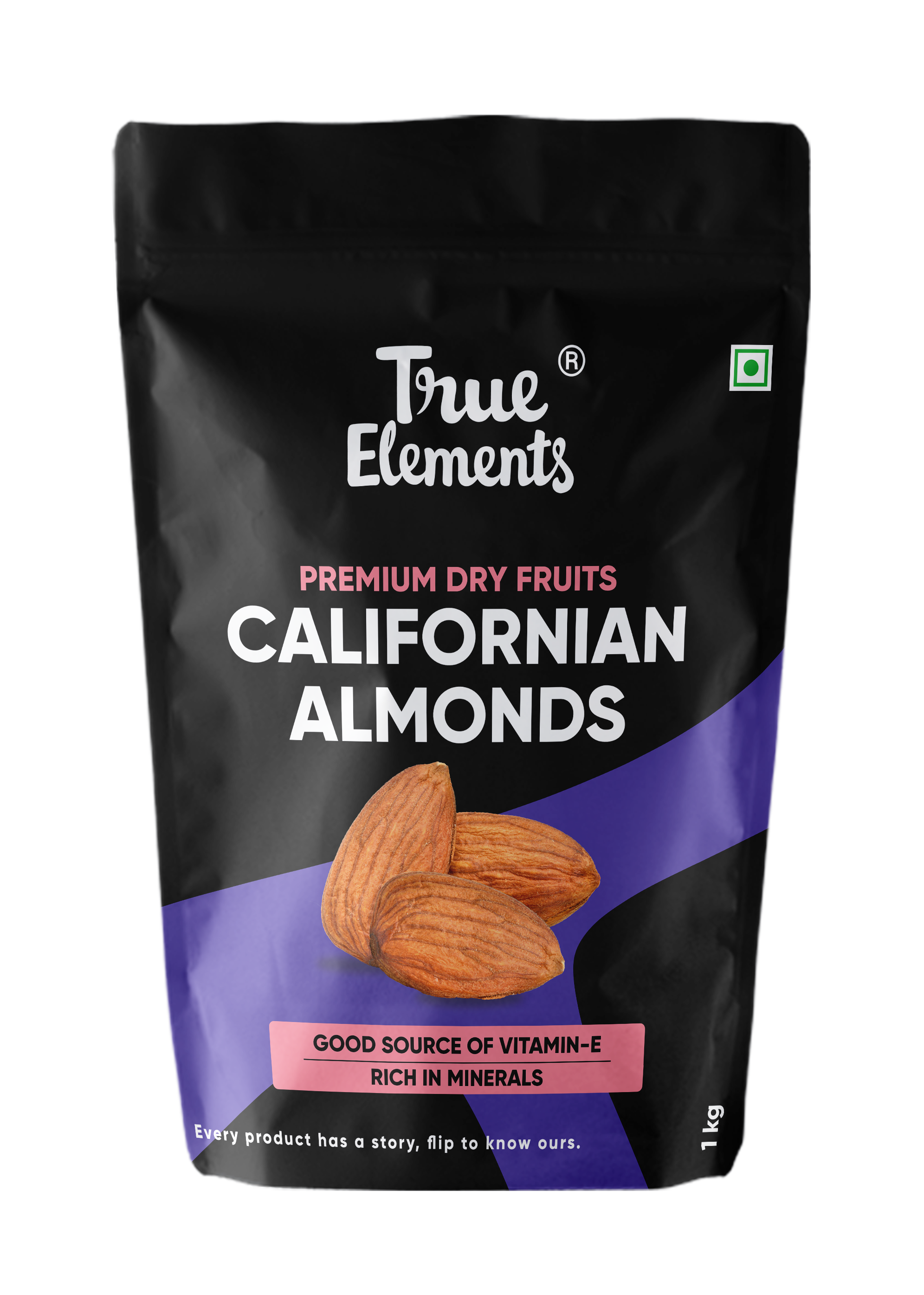 True Elements Californian Almonds are handpicked, premium quality, 100% natural & whole almonds. We internationally source them from the best vendor available in the market. They are hygienically cleaned & have no residues. Our almonds are highly nutritious nuts that are loaded with essential fats, dietary fibre, protein, omega 3 Fatty acids & more. They are also low in glycemic index.