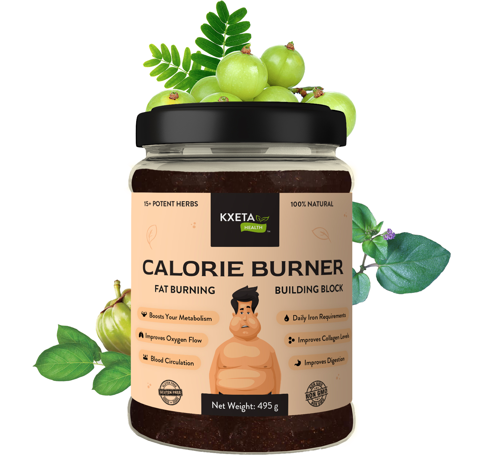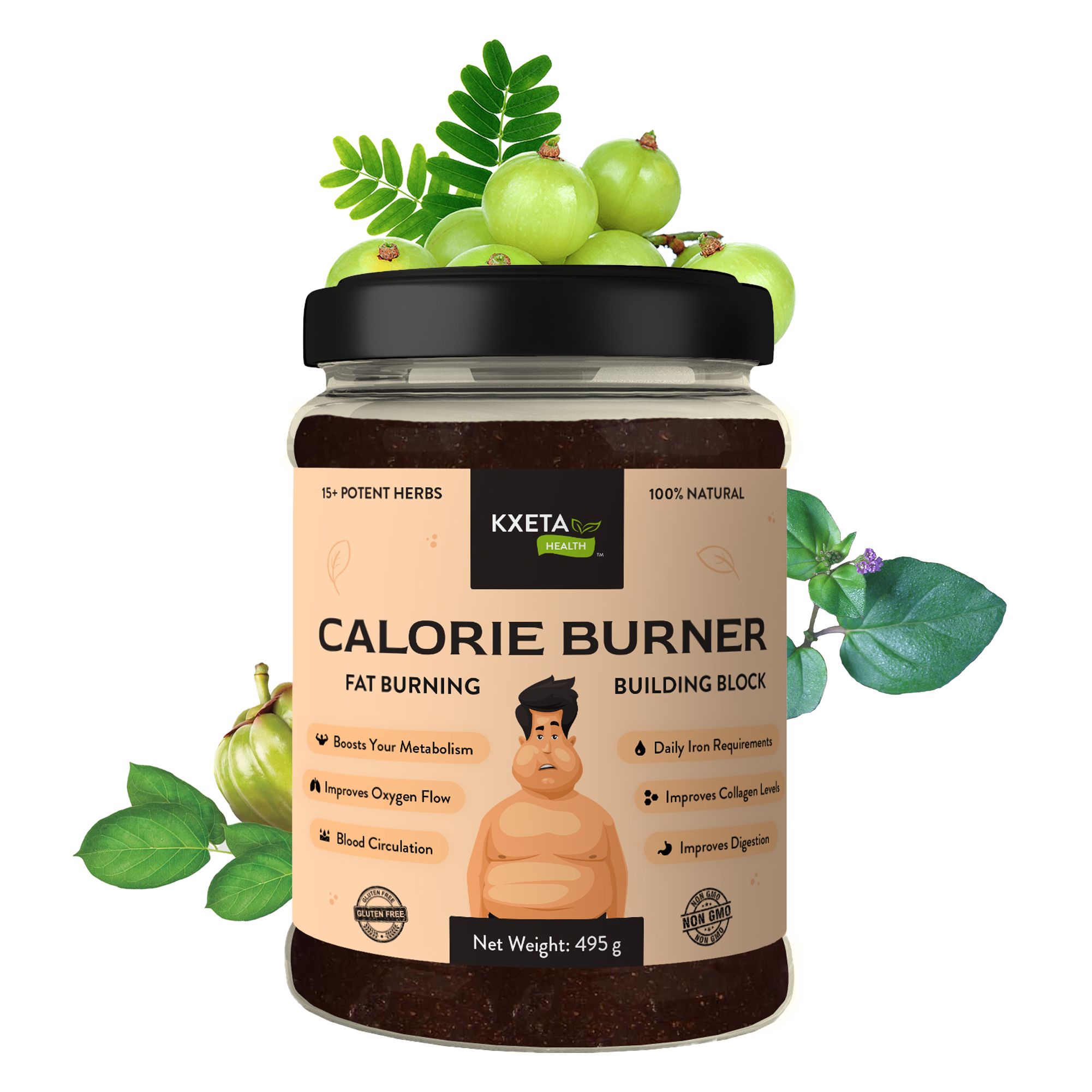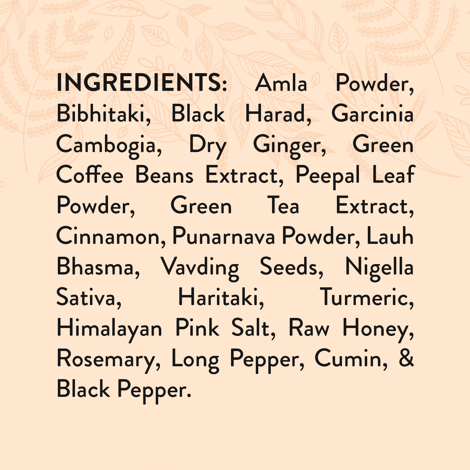 Amla Powder, Bibhitaki, Black Harad, Garcinia Cambogia, Dry Ginger, Green Coffee Beans Extract, Peepal Leaf Powder, Green Tea Extract, Ceylon Cinnamon, Punarnava Powder, Lauh Bhasma, Vavding Seeds, Nigella Sativa, Haritaki, Turmeric, Himalayan Pink Salt, Raw Honey, Rosemary, Long Pepper, Cumin & Black Pepper