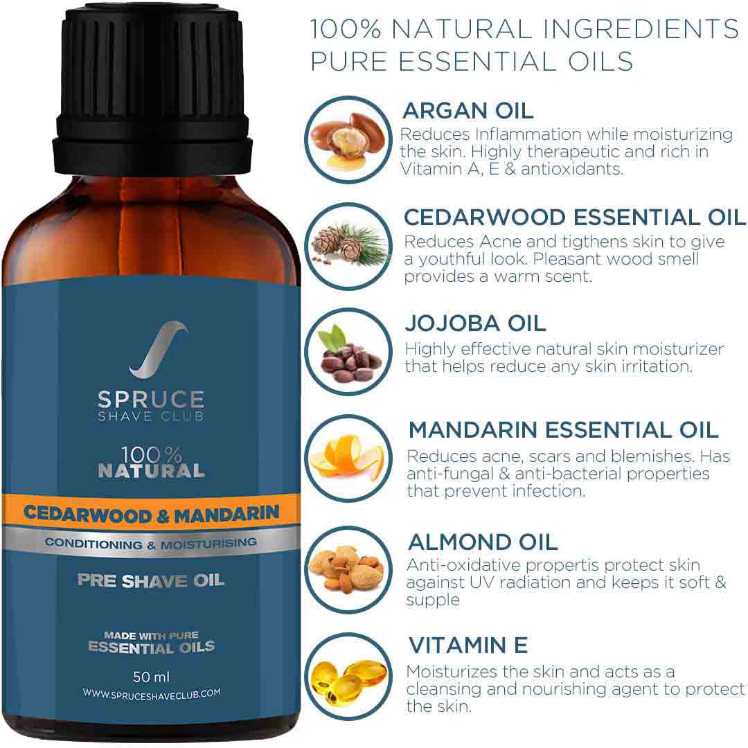 This product is a specially developed product that is 100% natural and made with pure essential oils. The natural essential oils prepare the skin for a smooth shave by softening the hairs and creating a layer on the skin to help the razor smoothly glide over the skin. It helps the razor cut through the hairs without causing any razor burns. The natural oils like cedarwood, argan oil, jojoba oil, almond oil have many antiseptic and antibacterial properties that help keep the skin safe and soft. Regular pre shave skin prepping with this amazingly light, non greasy and non-sticky formulation helps reduce acne, redness and irritation. It is a must have shaving essential that deserves a place in your shaving kit. It helps open up your pores and prepare facial hairs for a smooth and close shave and it suits all skin types. Ingredients like hydrogenated castor oil, argan oil, cedarwood essential oil, almond oil, jojoba oil, vitamin-E and mandarin essential oil are involved.