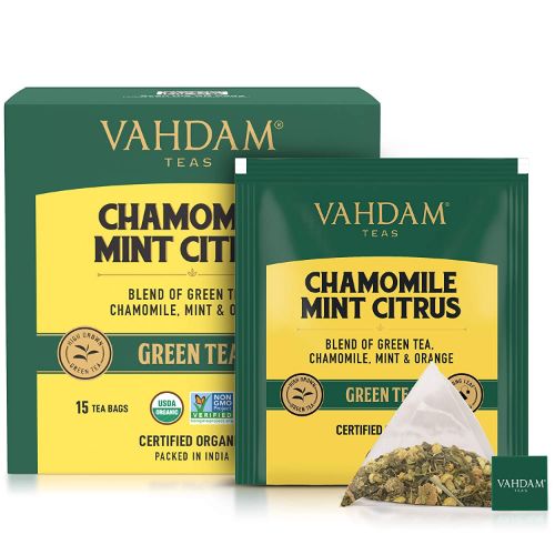 With uplifting floral and fresh citrusy notes, this green tea blend is a generous dose of buoyant chamomile flowers, fresh peppermint, mixed with joyous, citrusy tones of lemongrass and orange peels. Indulge in this cup with fragrant and fresh vegetal flavors that brings together the alleviating powers of chamomile and the freshness of mint.