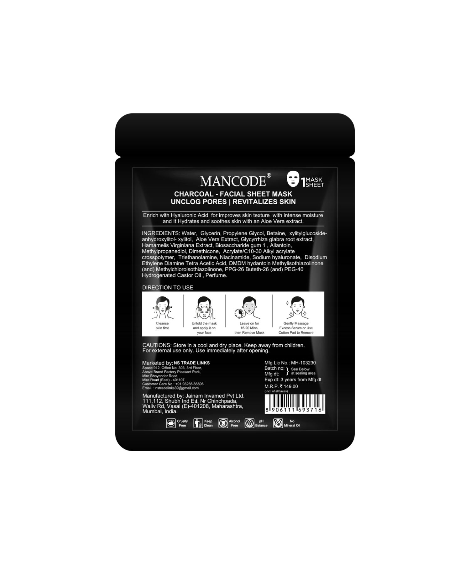 Mancode charcoal face sheet mask for men which will not only deep cleanse your skin but will also be effective in removing the dirt and detoxify it . Detoxify, restore and rejuvenate your skin with the specially designed mancode activated charcoal face sheet mask to get you all hydrated and feeling good as ever. Each fiber of the mask is powered by activated charcoal hyaluronic acid and aloe vera extract which extracts all impurities from the surface of your skin. Activated charcoal may help by removing bacteria and other impurities from your pores. Controls oiliness. By removing dead skin cells and absorbing excess oil, give your skin a healthy glow with mancode activated charcoal facial sheet mask for men.