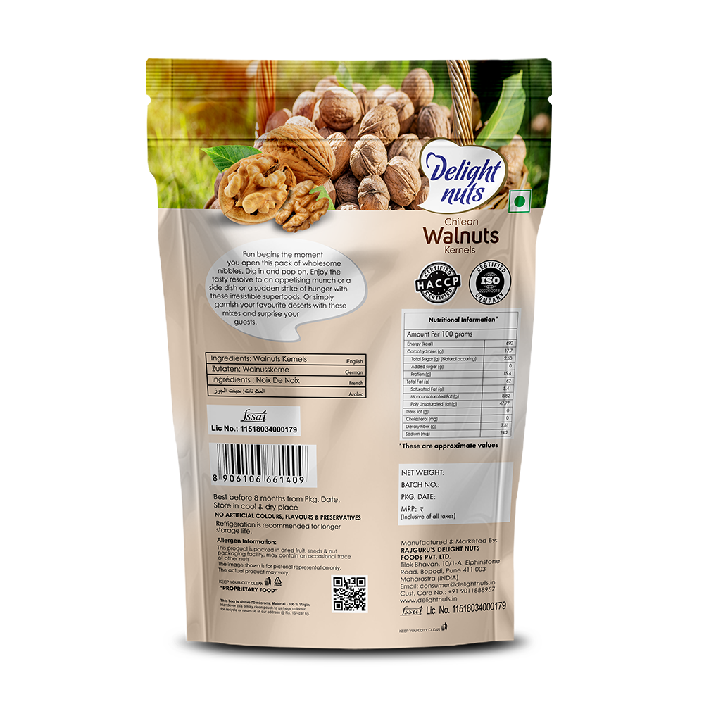 Our Chilean Walnut Kernels are big, blissful chunks of nutritional goodness. Offered in their natural, raw and whole avatars, these dry fruits pack a punch of health and all smiles. Packed raw and whole, our Chilean Walnut Kernels have a soft yet crunchy texture.