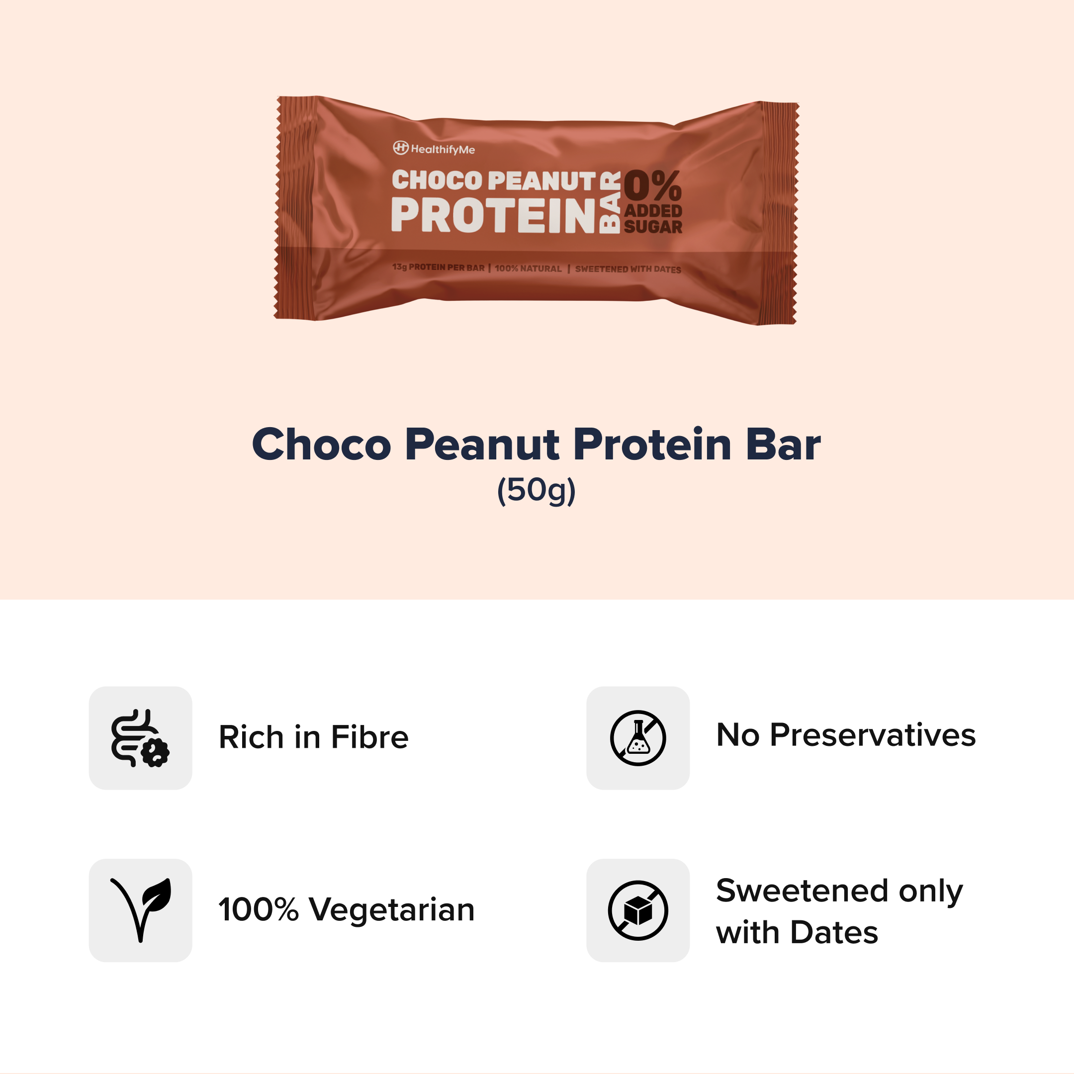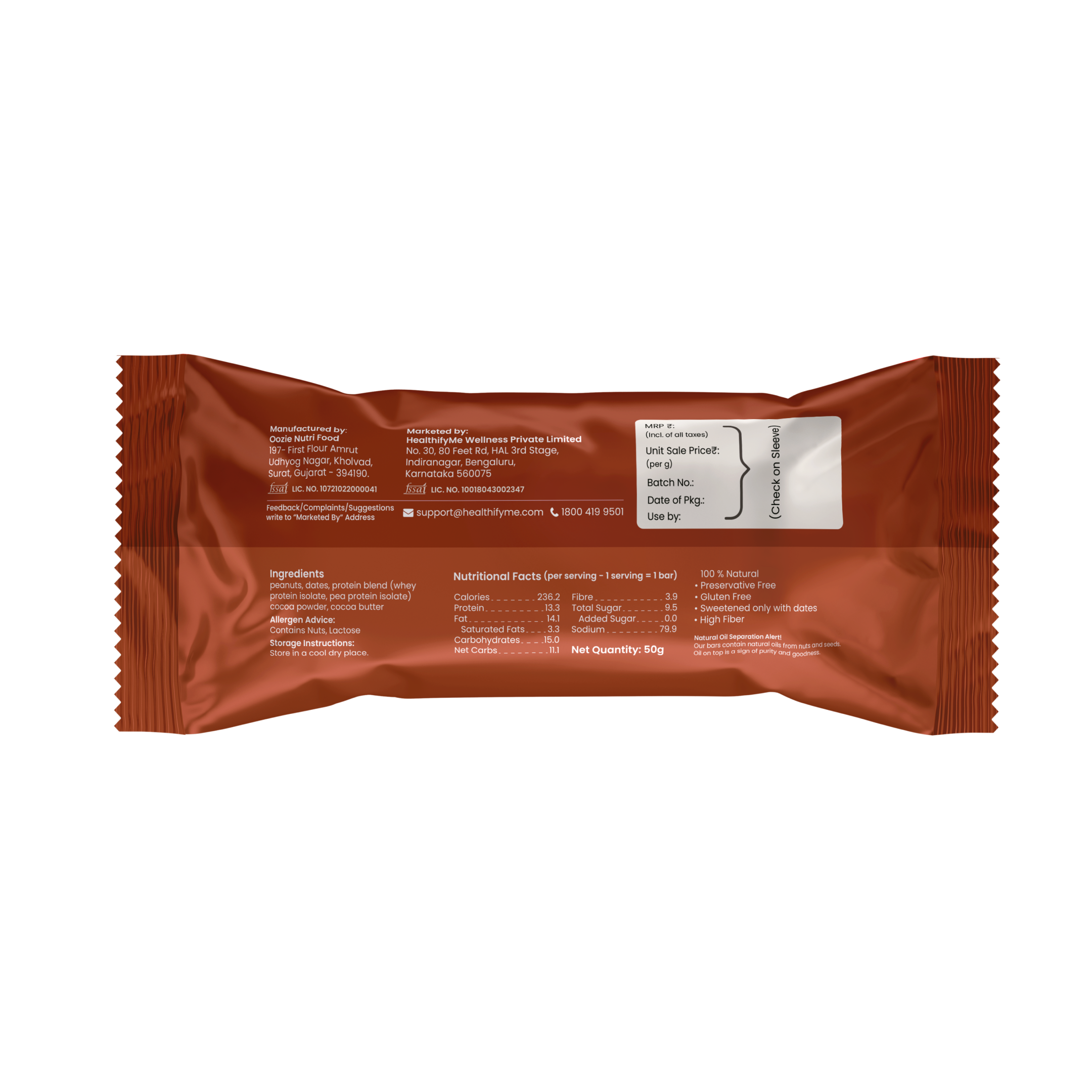 Enhance your protein intake with this Choco Peanut Protein Bar (Pack of 10). Crafted with peanuts, dates, and a blend of whey and pea protein isolates, it's a delectable protein source. Enriched with cocoa powder and cocoa butter, this bar offers a satisfying chocolatey taste.
