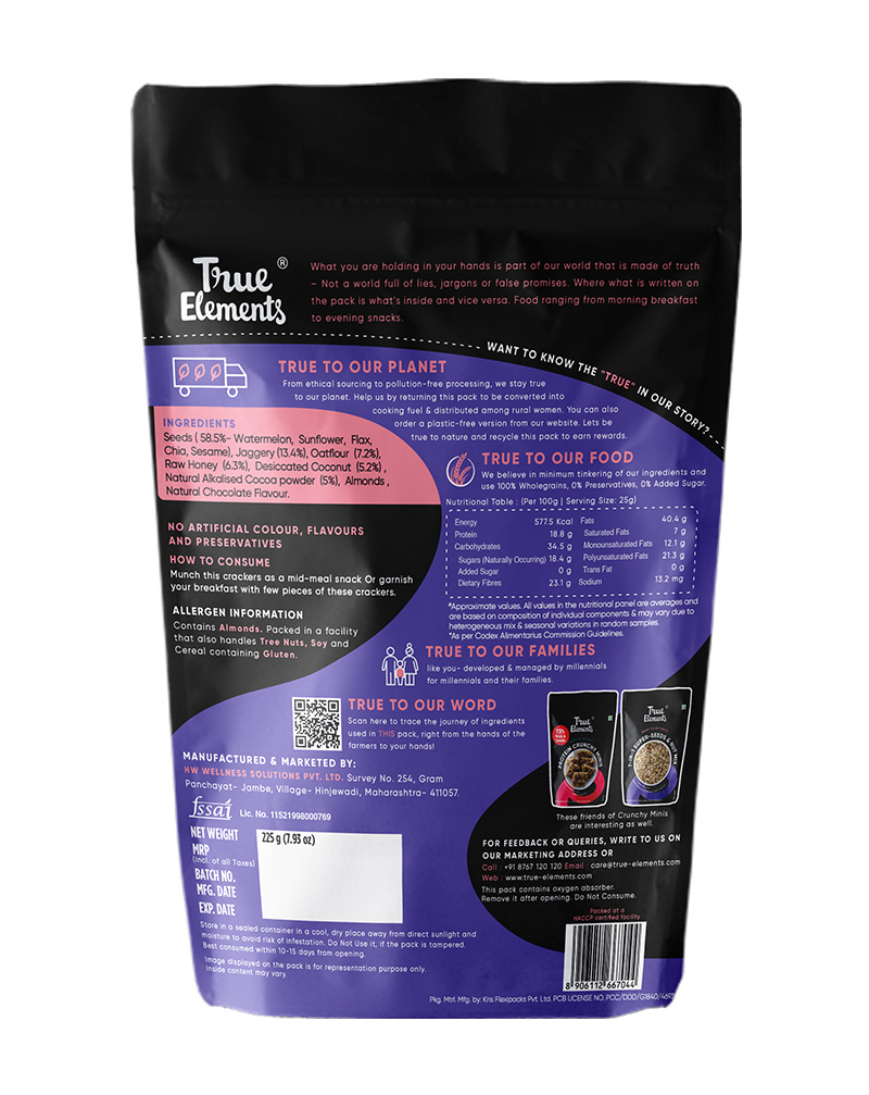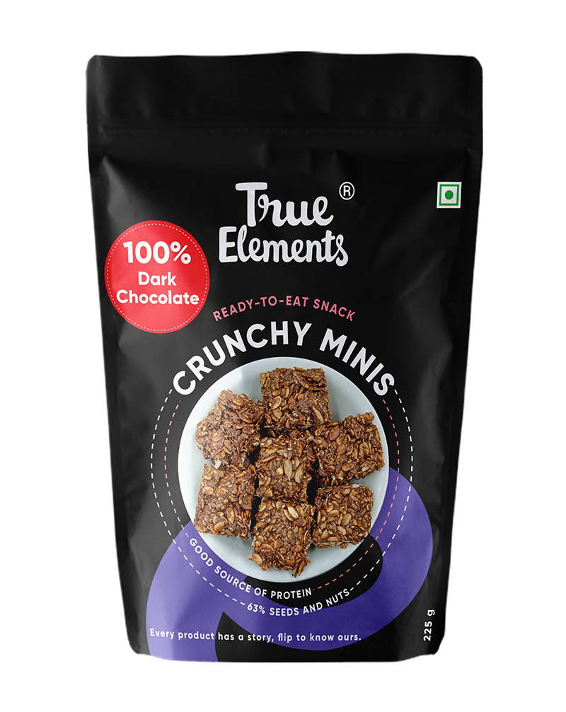 Looking for the perfect snack for mid-meal hunger pangs? A guilt-free dessert? Protein-rich pre/post-workout snack? Energizing mid-shopping snack? Heres your solution to all the different types of snacking occasions: True Elements Chocolate Crunchy Minis! Chocolate Crunchy Minis are mini-sized bars with huge benefits! Made with the perfect blend of wholesome ingredients like 100% whole grain oats, super seeds, crunchy almonds, natural chocolate flavours & sweetened with only honey & jaggery. It comes with the True Elements signature chocolate flavour and cocoa powder. Has no bad stuff like refined sugar, milk solids, or sugar under any other name. We use alkalized cocoa powder instead of artificial flavours. These minis are rich in fibre, protein, essential fats & other nutrients. The high fibre content can help improve your gut health while keeping you satiated for longer durations & high protein can help boost energy level while helping with weight loss. So next time you crave something tasty & healthy, reach out to chocolate protein minis to indulge in guilt-free snacking!