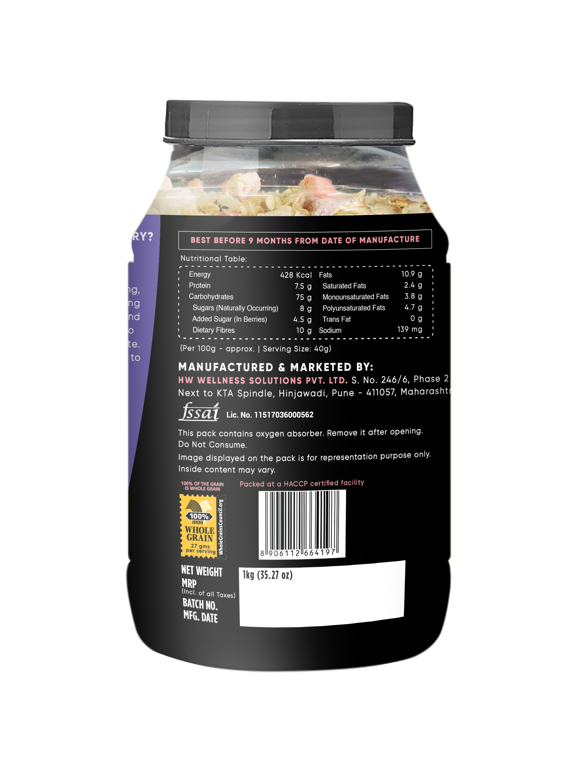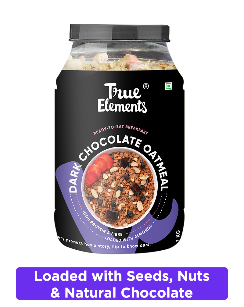 True Elements Dark Chocolate Oatmeal is here to make your mornings healthy and delicious. Oatmeal being a storehouse of dietary fiber, protein & vitamins, provides you with ample energy to get through your day whereas the Chocolate in this oatmeal assures a good mood and happy endorphins.In addition to the crunchy, wholegrain rolled oats and decadent chocolate flavour, our oatmeal is also packed with the goodness of chia seeds, watermelon seeds, almonds and black currant. Sweetened with Raw Honey and Jaggery, this is definitely one of the tastiest healthy breakfast/meal options.