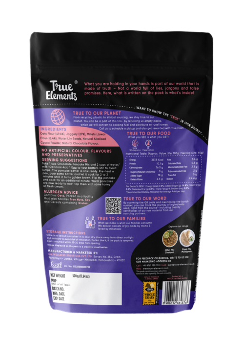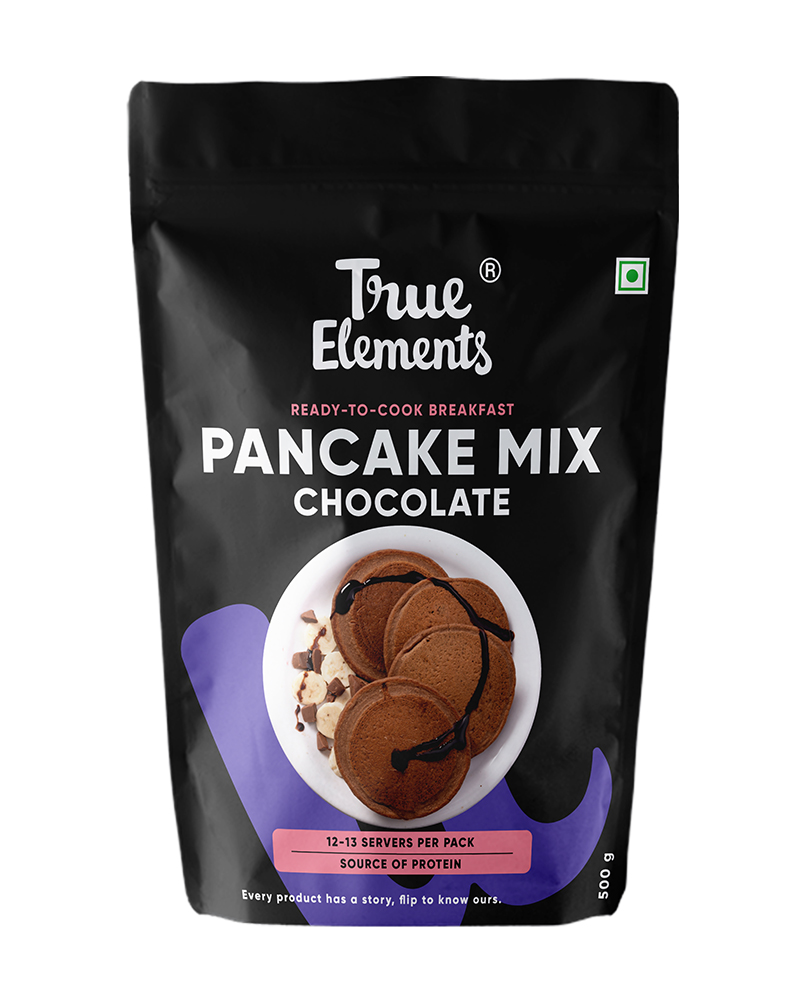 Introducing True Elements Chocolate Pancake mix, made of Oats, Jowar flour and Natural Cocoa Powder. We use freeze dried curd, a healthy fermenting agent instead of baking soda & jaggery instead of sugar to make pancakes a guilt-free snack. These are perfect for kids or even adults to get their dose of protein and nutrition through these tasty pancakes. You can top these pancakes with fresh fruits, raw honey or some chocolate sauce, the options are endless.