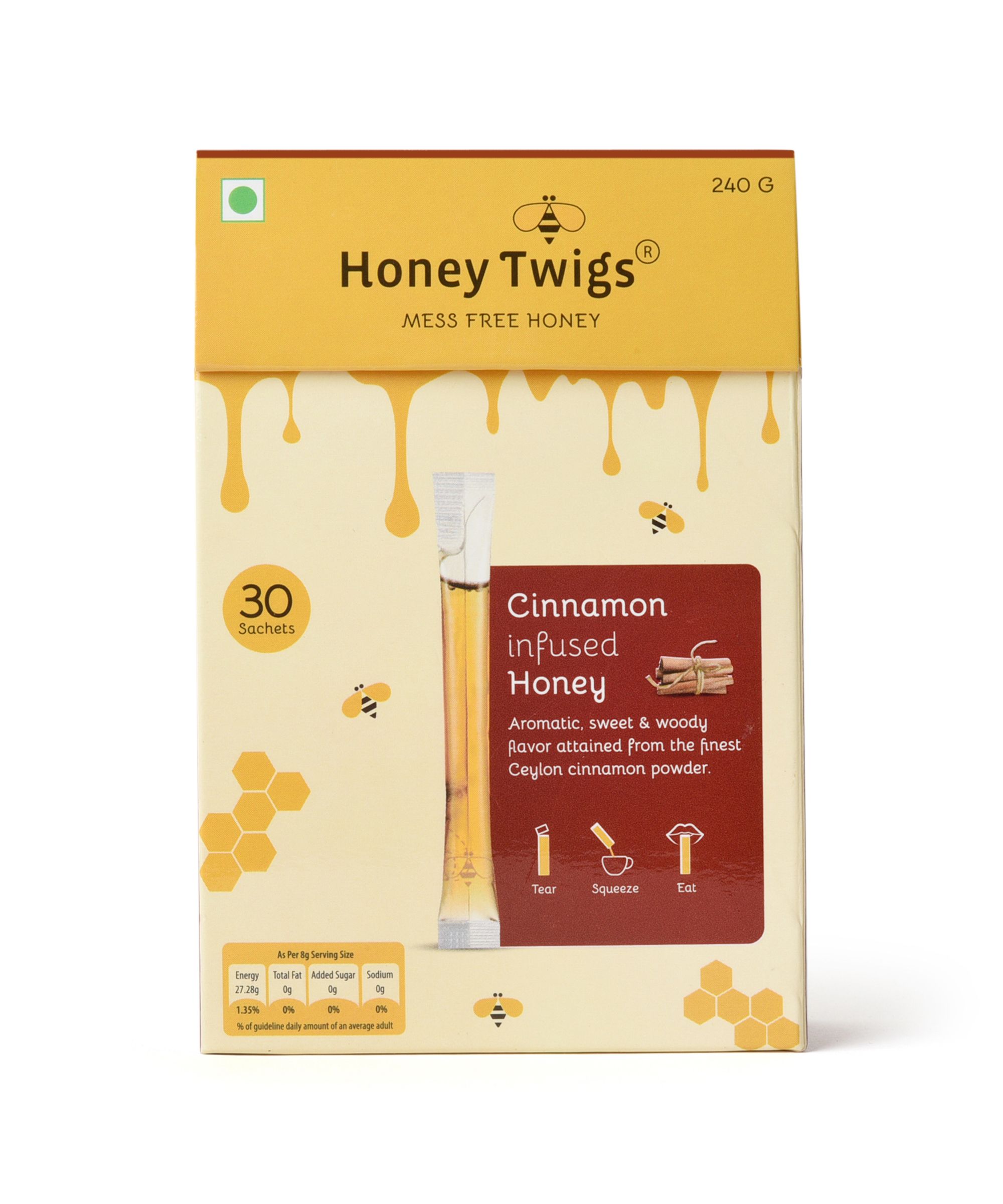 Cinnamon Honey Twigs An infusion of aromatic and woody cinnamon from Ceylon with our premium honey makes this sweet and spicy concoction a perfect balance of flavour and health. Pack Size - 8g x 30 Twigs = 240grams Best Paired With - This tastes so good straight from the twig; Drizzle this honey on your toast; Add to black coffee and thank us later; A glass of warm milk and cinnamon honey just before you sleep; You can't go wrong with a cup of green tea with cinnamon honey; A perfect sweetener for your milk tea
