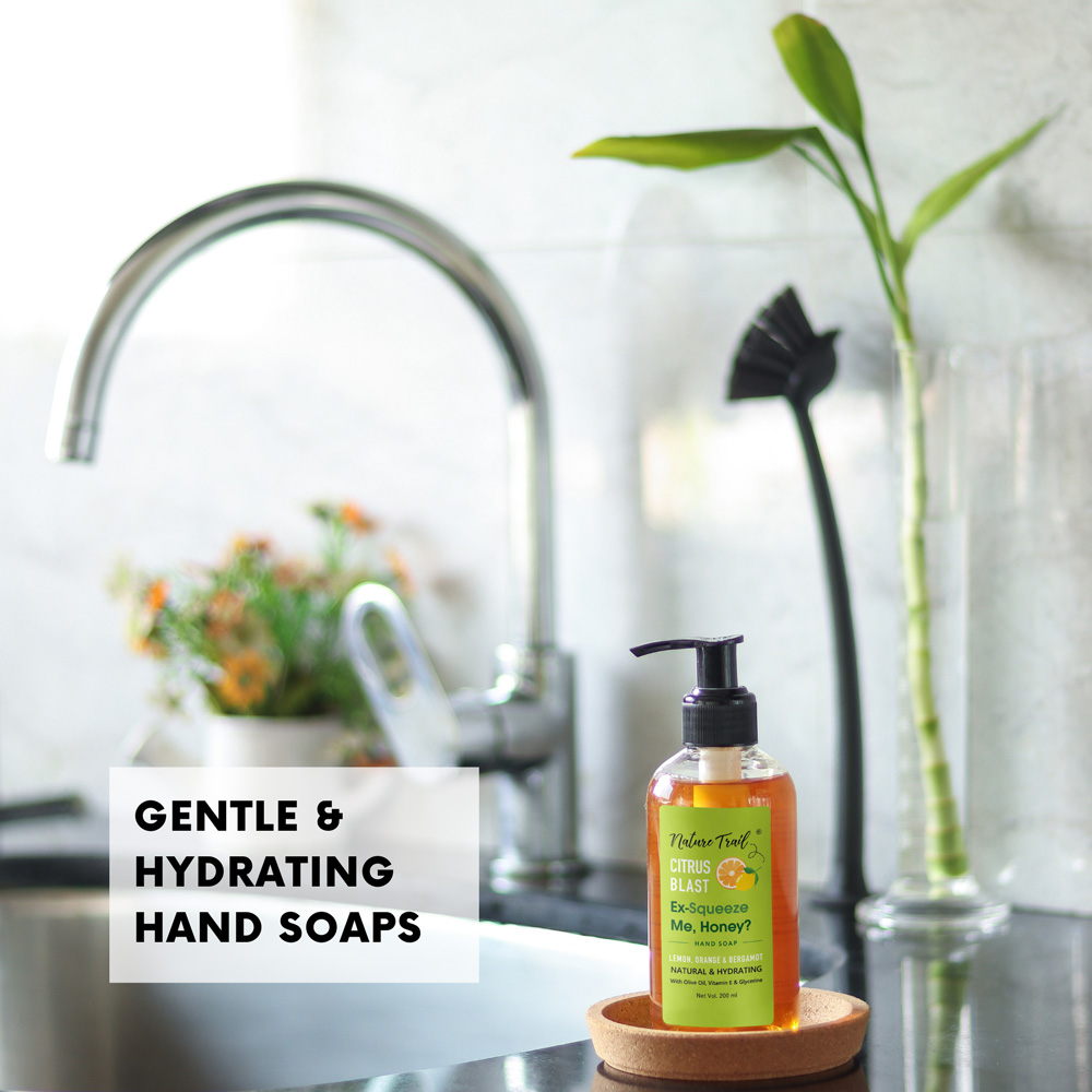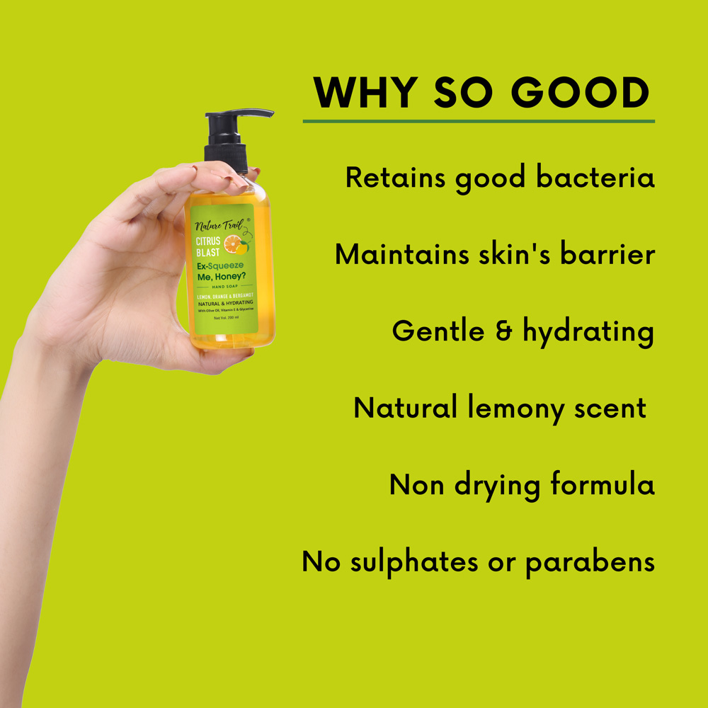 Nature Trail Citrus Blast Hand Wash is a gentle cleanser that cleans hands effectively while maintaining skin's natural barrier. It soothes, nourishes & moisturizes your hands. Hands don't feel dry, stretched or stripped, even with repeated handwashing. Non drying formula. Sulphate & paraben free. Mild natural scent of lemon, orange & bergamot essential oils.