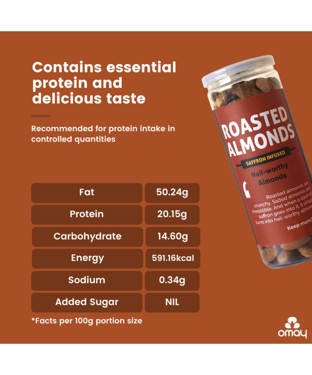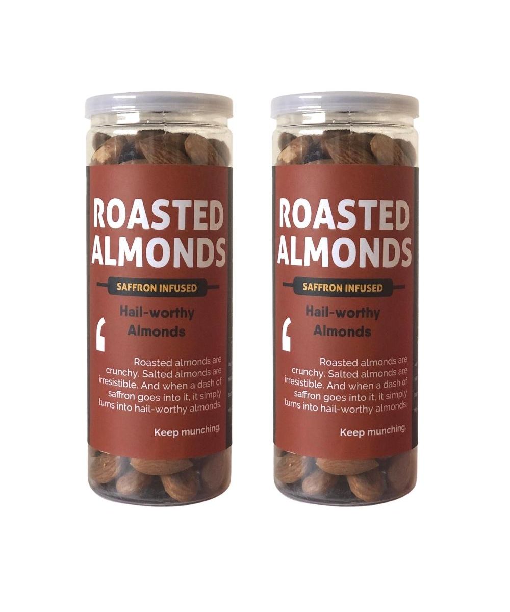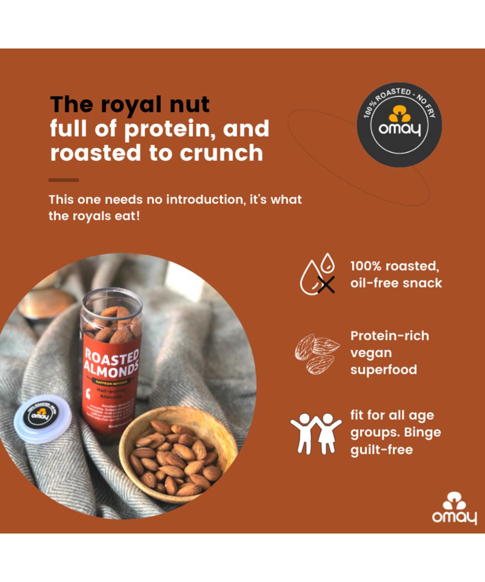 Roasted, Oil-free Whole Almonds: Hail-worthy Almonds! Roasted almonds are crunchy. Salted almonds are irresistible. And when a dash of saffron goes into it, it simply turns into hail-worthy almonds! Keep munching. 100% roasted, non-fried healthy snack.Benefits: