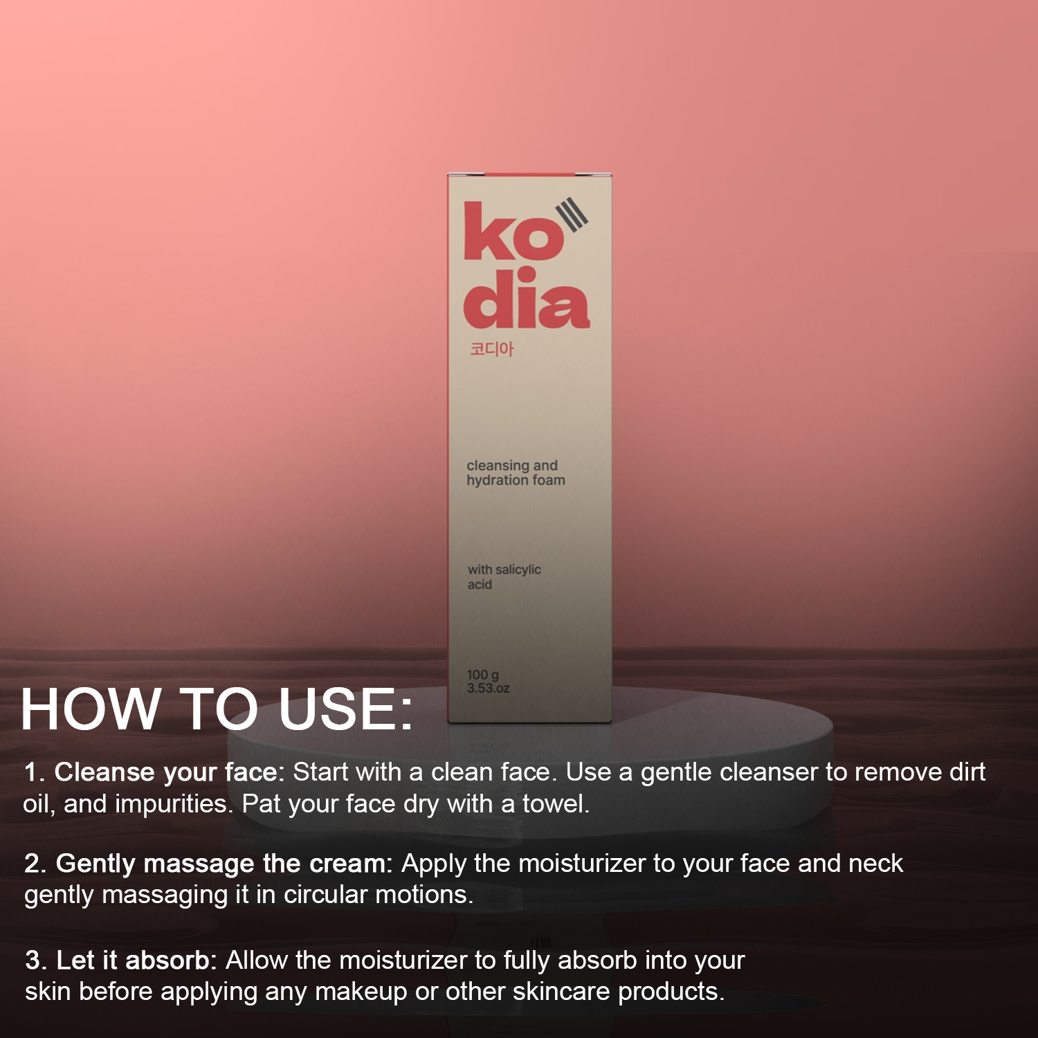 1. Wash your face with Kodia Skin Revive Cleaning and Hydration Foam by taking an appropriate amount and gently massaging it all over your face. 2. Wash it immediately with water and pat dry.