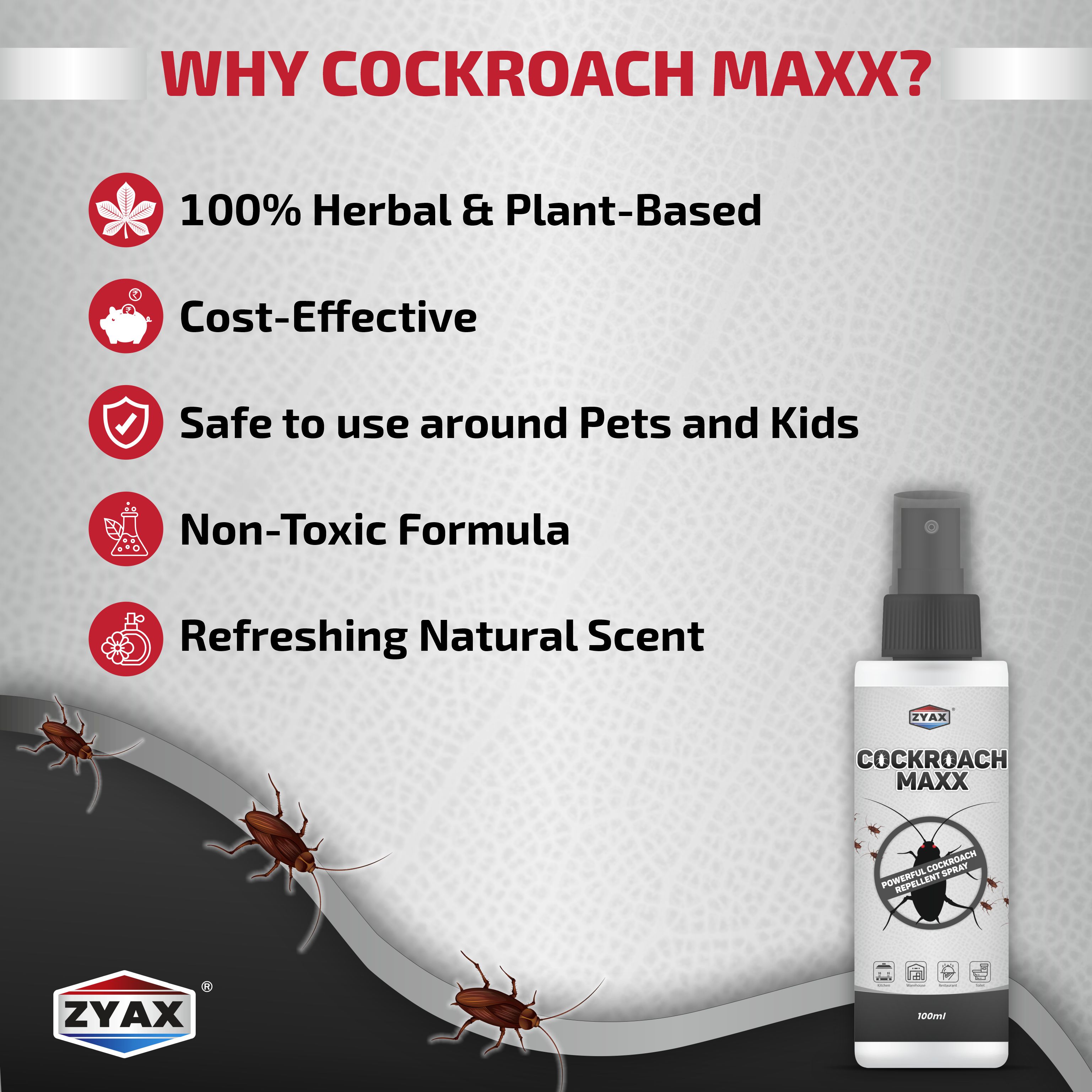 Zyax Cockroach Maxx Cockroach Repellent Spray is a compact and powerful solution designed to repel and deter cockroaches from infesting your living spaces. This 100 ml spray bottle provides a convenient size for targeted application and easy storage. The specific formulation of Zyax Cockroach Maxx is intended to create a barrier that cockroaches find unpleasant, discouraging them from entering or remaining in treated areas. The active ingredients in the spray are likely chosen for their effectiveness in repelling cockroaches. To use ZYAX Cockroach Maxx, shake the bottle well and spray the repellent directly in areas where cockroaches are commonly found, such as cracks, crevices, baseboards, and entry points. It's important to apply the spray in a way that ensures adequate coverage of the desired surfaces. While the repellent properties of Zyax Cockroach Maxx may deter cockroaches, it's worth noting that a comprehensive approach to cockroach control is usually necessary for effective results. This can include practicing good sanitation, removing food and water sources, sealing entry points, and using a combination of repellents, baits, or insecticides as recommended.