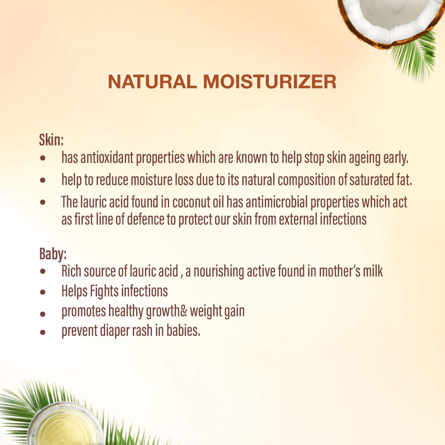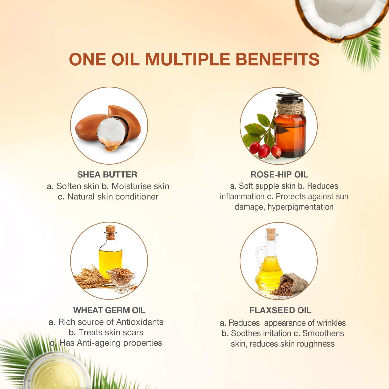 This product is 100% natural and is powered with Extra Virgin Coconut oil, Shea Butter, Rose Hip Oil, Wheat Germ Oil and Flaxeed Oil. Extra Virgin Coconut oil promotes cellular repair and penetrates 10 layers deep into the skin to restore lost moisture and repairs dry & damaged skin. Virgin Coconut oil also penetrates 90% into hair strands and repairs damaged hair by reversing upto 50% of internal structural damage. Lauric Acid present in coconut oil binds the protein in hair & scalp, and helps protect both the roots and strands of hair from breakage. Shea Butter softens & moisturizes skin and acts as a natural skin conditioner. Rose Hip Oil reduces skin inflammation, protects sun damage and prevents hyperpigmentation. Wheat Germ Oil is a rich source of anti-oxidants and is effective in treating skin scars and has anti-ageing properties. Flaxseed Oil reduces appearance of fine lines & wrinkles and is effective in treating stretch-marks.