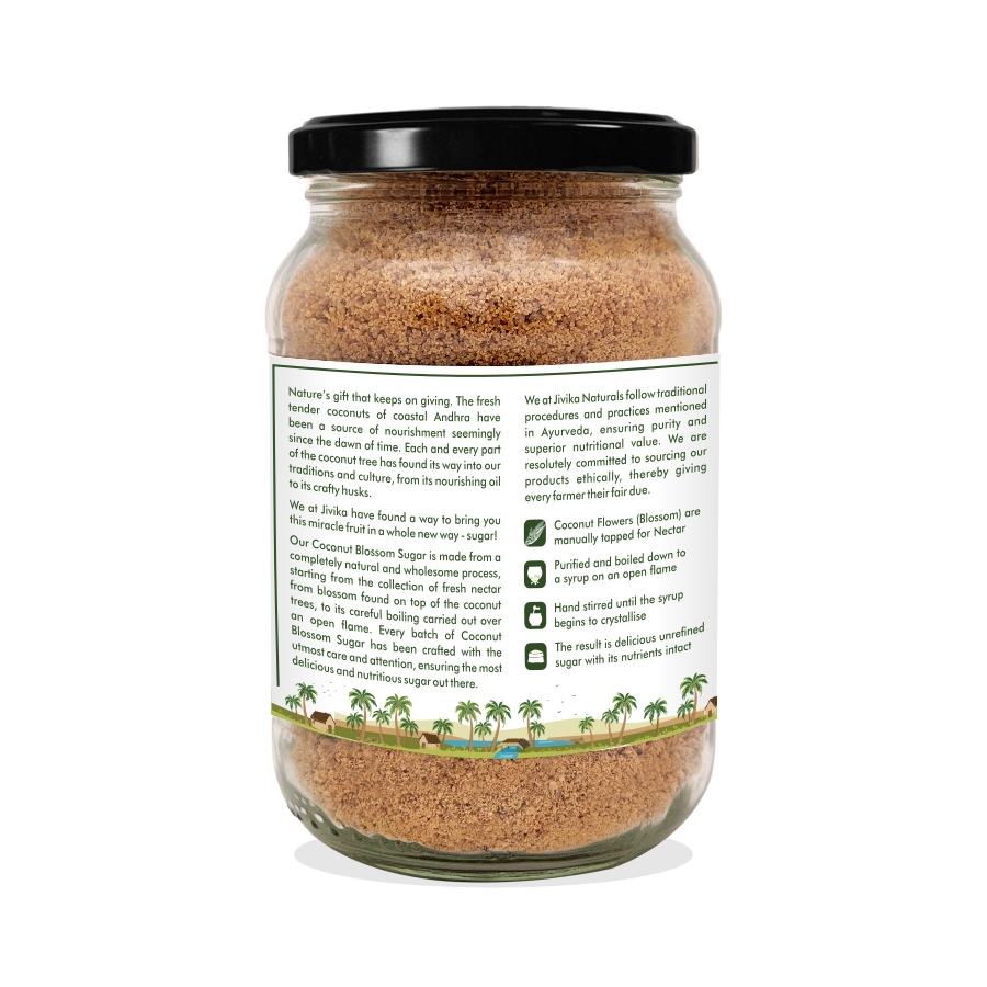 Coconut Blossom Sugar is made from a completely natural and wholesome process, starting from the collection of fresh nectar from the very top of the coconut trees, to its careful boiling carried out over an open flame. Every batch of Coconut Blossom Sugar has been crafted with the utmost care and attention, ensuring the most delicious and nutritious sugar out there.