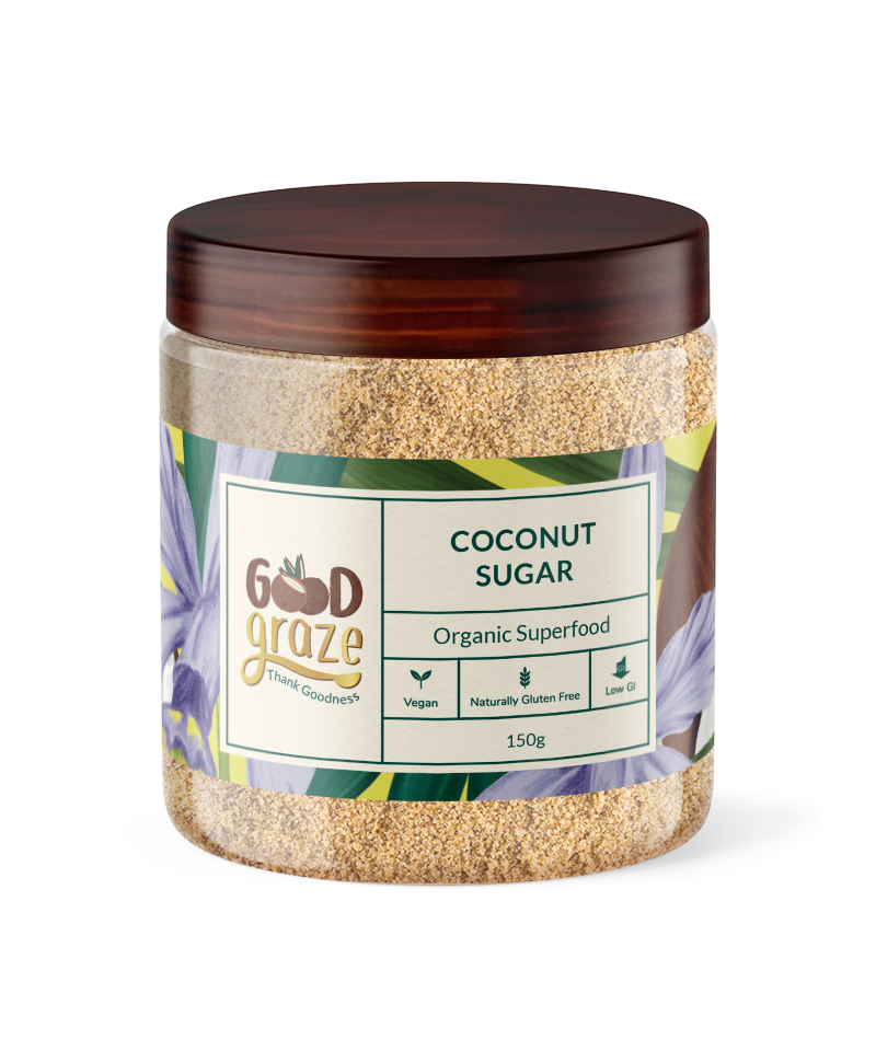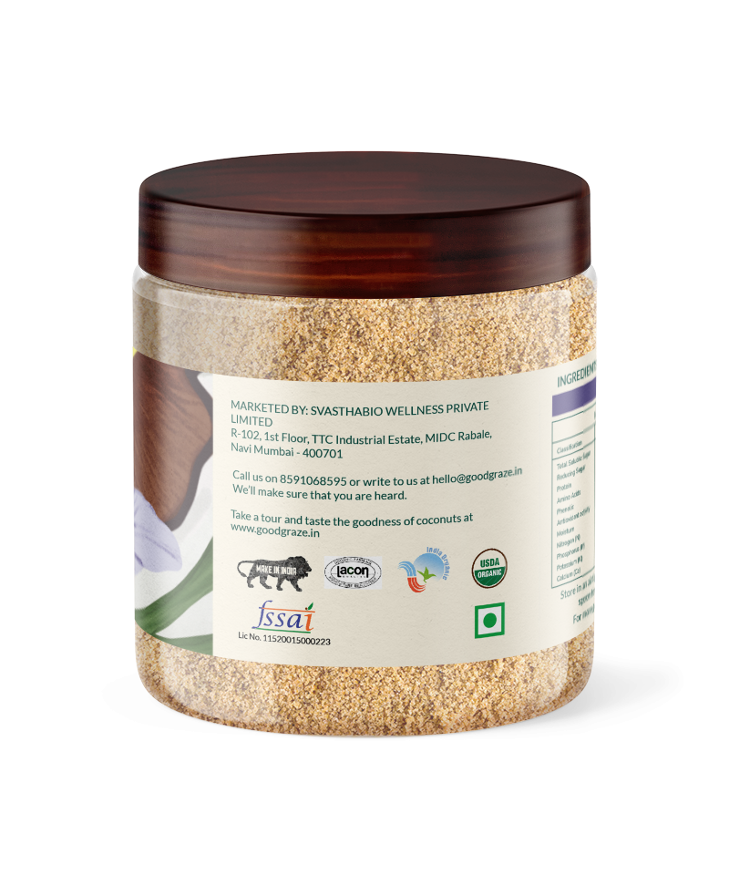 Good Graze Organic Coconut Sugar is obtained from the sap of the coconut flower, which is naturally processed to obtain cococonut sugar. No chemicals are used in the processing. The farms where these coconut trees are grown are organic certified as well. Organic Coconut sugar is a better alternative to table sugar which is chemically processed.