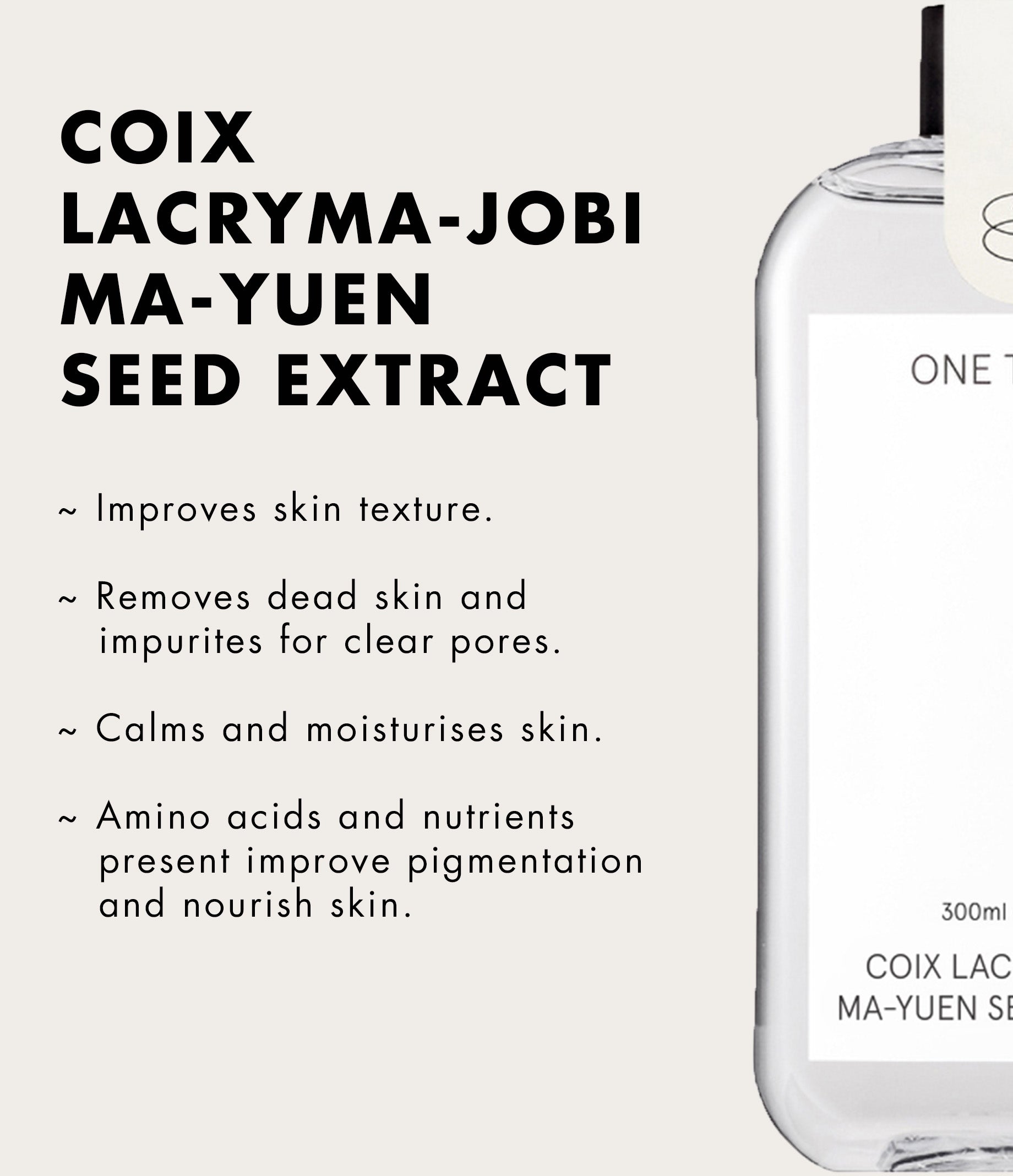 The ONE THING Coix Lacryma-Jobi Ma-Yuen Seed extract is manufactured using organic, pesticide-free seeds grown in South Korea. A 100% plant-derived extract, it is a vegan product and is also cruelty-free. Its lightweight, watery texture makes it suitable for all skin types, especially oily skin or dehydrated skin. It can also thus be used during the day or night, and right before makeup. Coix Lacryma-Jobi Ma-Yuen seeds contain a large number of amino acids that make up proteins and are rich in nutrients- such as Calcium, Iron, and Vitamin B. These help remove dead skin cells and impurities from the skin. Also known as Adlay Extract, it helps moisturize and calm the skin, as well as control acne breakouts and excess sebum production. The Coix Seed extract also clarifies and reduces pigmentation. It also improves skin texture and is a low pH extract so it helps balance the skin's pH as well.