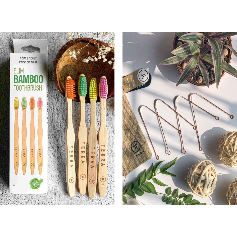 Copper Tongue Cleaner Scrapper - Made from 100% pure copper, this product is a better alternative to plastic tongue cleaners. It helps prevent cavities, improve internal organ function, and aid digestion. Each scrapper has its own marking for easier identification. Slim Bamboo Toothbrushes - This product is developed by dentists and made from sustainably sourced moso bamboo. It is durable, as this pack of 4 brushes will last one person an whole year or you can also buy one for each person in your household and splinter-free.