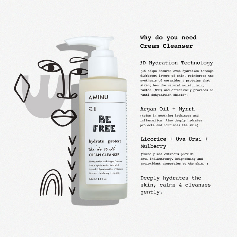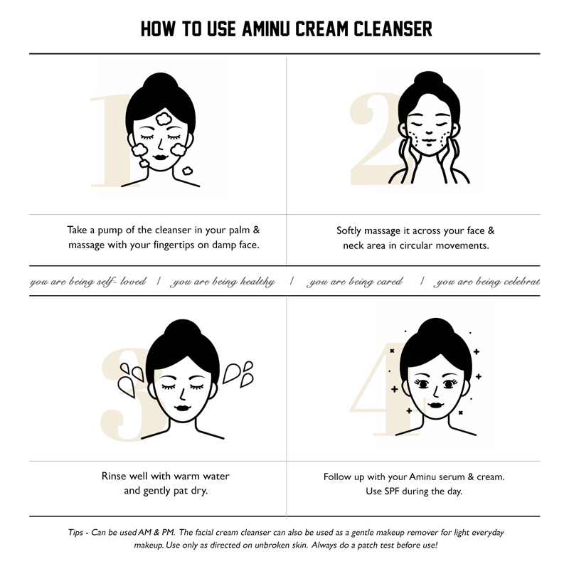 Take a pump dose of facial cream cleanser in your palm and massage with your fingertips on a damp face. Rinse with warm water and pat dry. Follow up with your favorite AMINU serum, facial oil, or cream. Use AM & PM. Use SPF during the day