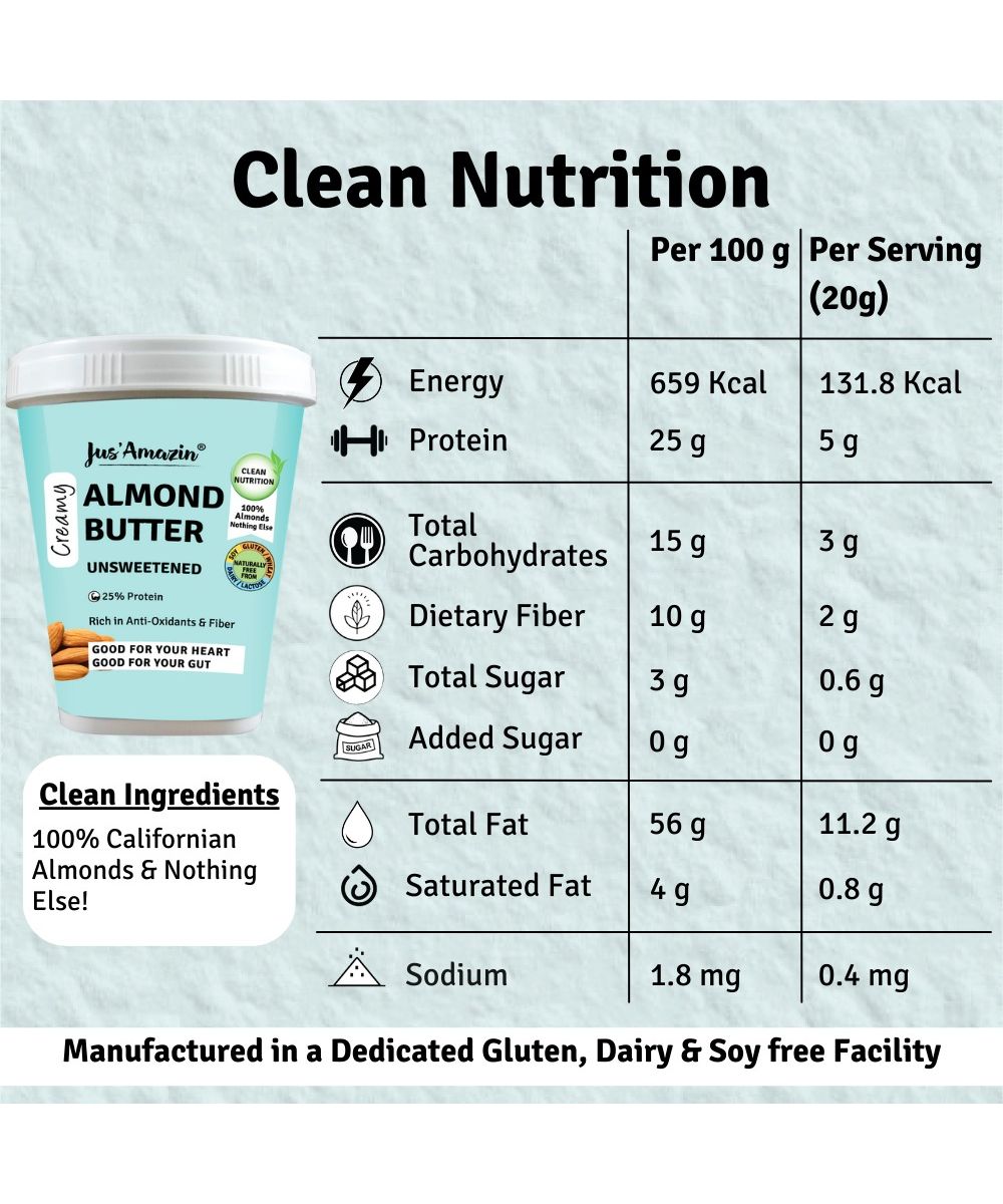 This delicious and nutritious protein packed Creamy Almond spread / butter (with 25% protein), is made from only 1 ingredient - 100% premium Californian Almonds, and nothing else ! It provides Clean Nutrition, with Zero Junk (No refined sugar or chemicals or preservatives). It is packed with macro-nutrients (high protein, dietary fiber and healthy fats) and micro-nutrients (Vit B2, Vit E, calcium, iron, manganese, copper). Since it is high in dietary fiber, low in net carbs, and unsweetened, it is also diabetes friendly & keto friendly.