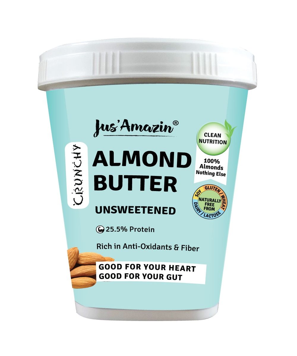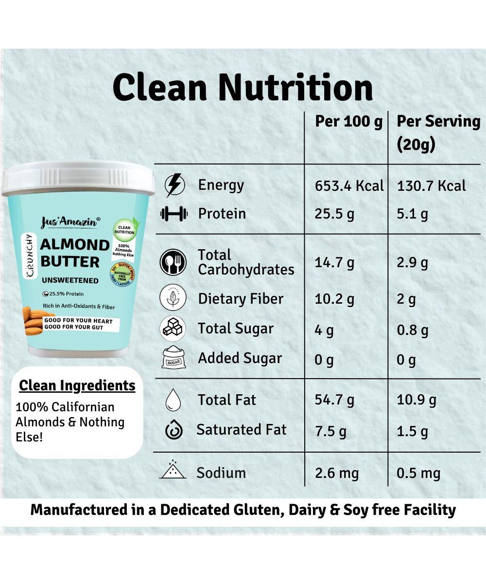 This delicious and nutritious protein packed unsweetened Crunchy Almond spread / butter (with 25.5% protein), is made from only 1 ingredient - 100% Premium Californian Almonds, and nothing else ! It provides Clean Nutrition, with Zero Junk (No refined sugar or chemicals or preservatives). It is packed with macro-nutrients (high protein, dietary fiber and healthy fats) and micro-nutrients (Vit B2, Vit E, calcium, iron, manganese, copper).Since it is high in dietary fibre, low in net carbs, and unsweetened, it is also diabetes friendly & keto-friendly.