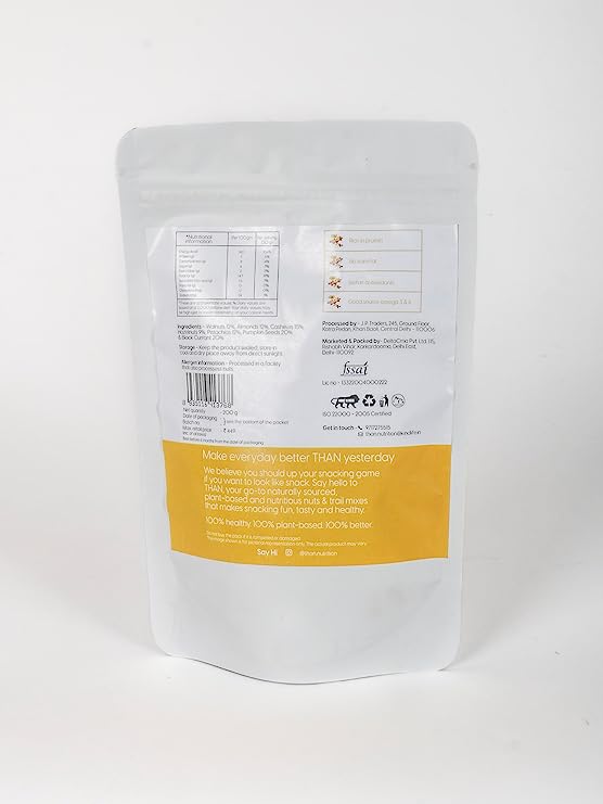 THAN's Premium Trail Mix: A complete mix of natural nuts, seeds, and dried fruits infused with herbal seasoning No cholesterol, no preservatives, Roasted, Oil-free, ready-to-eat Gluten-free, vegan-friendly snack Aims to bring healthy products from around the world, combining taste and nutrition. Nuts: Packed with healthy fats, fiber, and protein, nuts are a great source of important nutrients and antioxidants Reduces oxidative stress, lowers inflammation, and boosts immunity.
