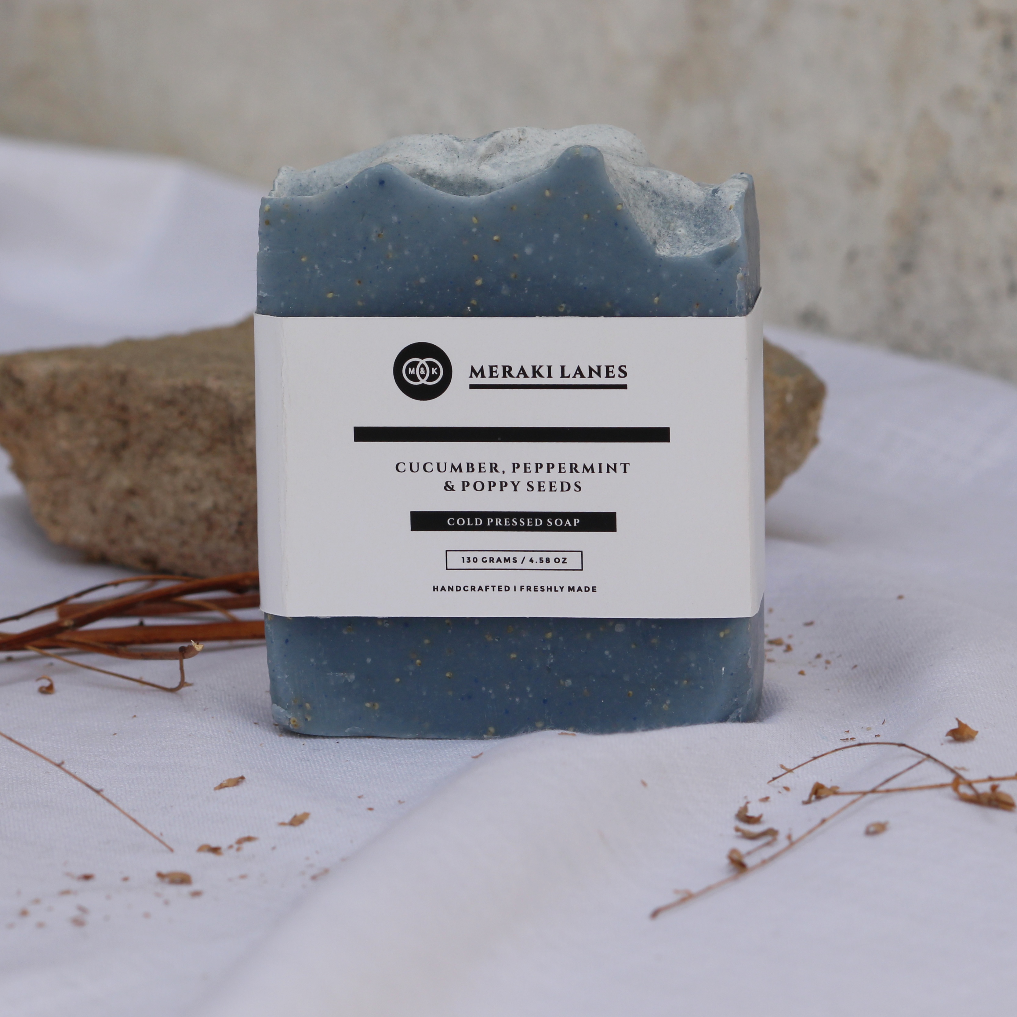 Coconut Oil, Olive Oil, Castor Oil, Almond Oil, Cocoa Butter, Shea Butter, Jojoba Oil, Cambrian Blue Clay, Cucumber Extract, Peppermint Essential Oil, Poppy Seeds, Distilled Water, and Sodium Hydroxide