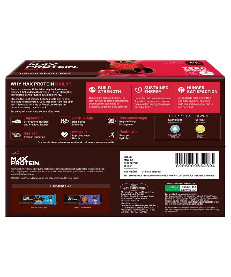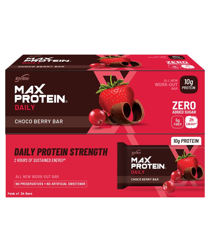 RiteBite Daily Choco Berry bar has the amazing punch of berries with goodness of chocolates to satisfy your taste buds. This bar is sugar-free, which makes it suitable for diabetics. This bar has sufficient protein (10gm) and fiber (5gm) to fill your daily nutritional gap. This prebiotic bar is 100% vegetarian and contains 21 Vitamins & Minerals, Electrolytes, Omega 3.