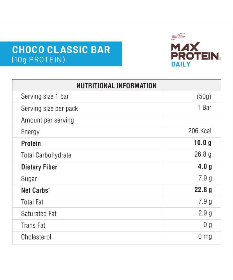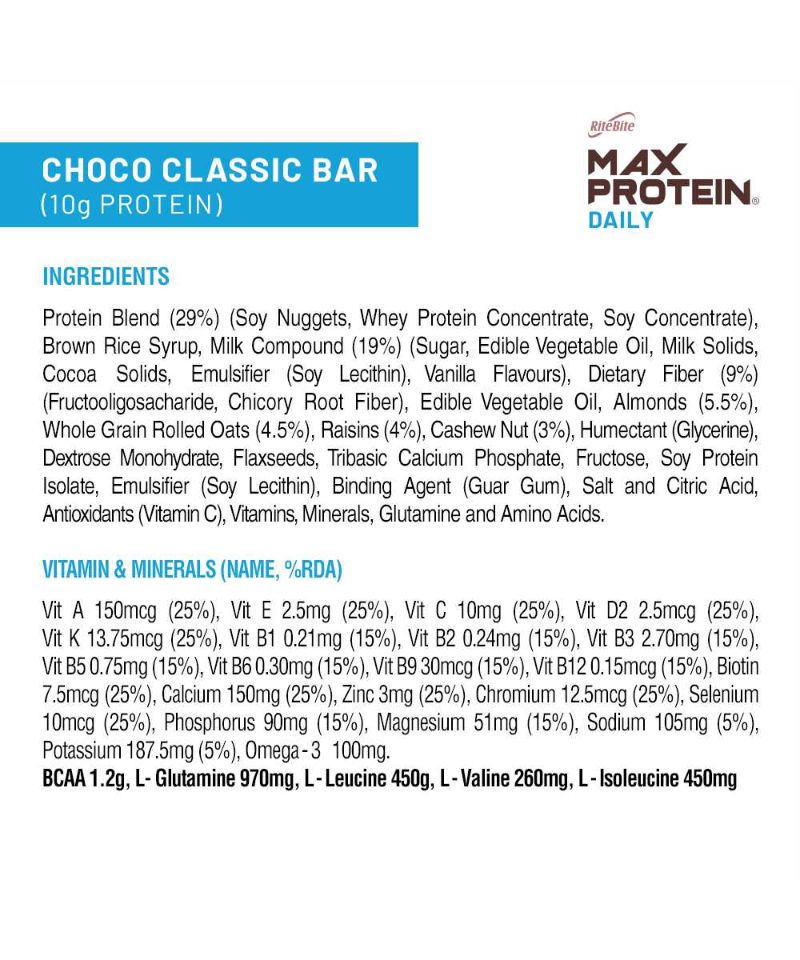 RiteBite Daily Choco Classic bar is made from tasty and delightful chocolate to make everyday more pleasant. It is the perfect bar for daily consumption whenever you need a boost. This bar has sufficient protein (10gm) and fiber (4gm) to fill your daily nutritional gap. This prebiotic bar is 100% vegetarian and contains 21 Vitamins & Minerals, Electrolytes, Omega 3.