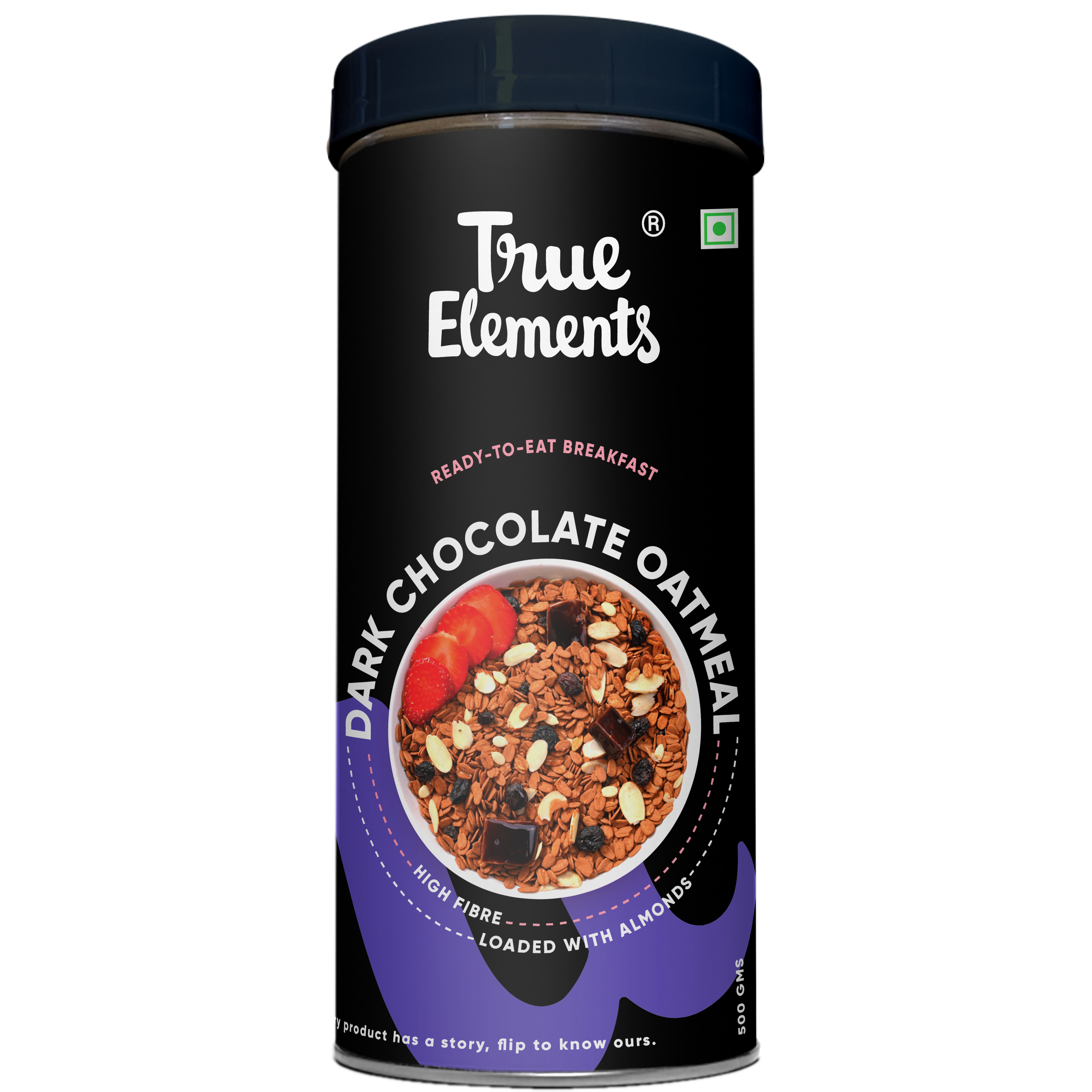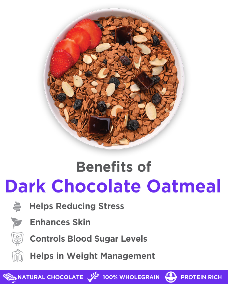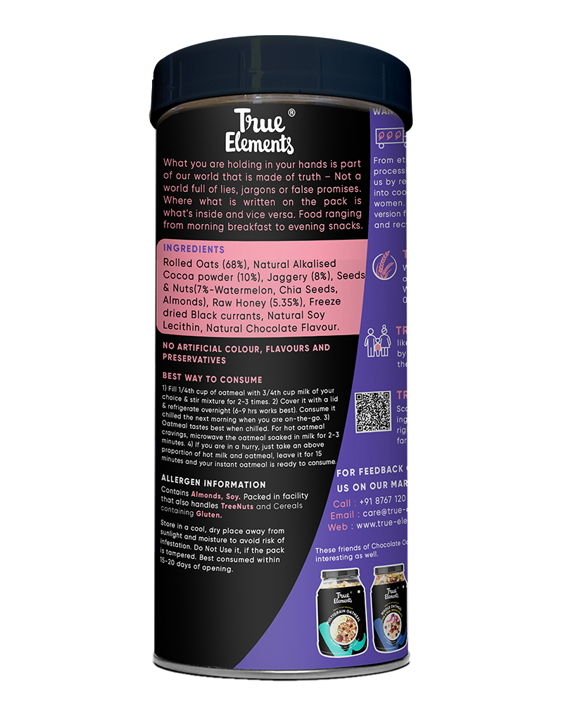True Elements Dark Chocolate Oatmeal is here to make your mornings healthy and delicious. Oatmeal being a storehouse of dietary fiber, protein & vitamins, provides you with ample energy to get through your day whereas the Chocolate in this oatmeal assures a good mood and happy endorphins.In addition to the crunchy, wholegrain rolled oats and decadent chocolate flavour, our oatmeal is also packed with the goodness of chia seeds, watermelon seeds, almonds and black currant. Sweetened with Raw Honey and Jaggery, this is definitely one of the tastiest healthy breakfast/meal options.