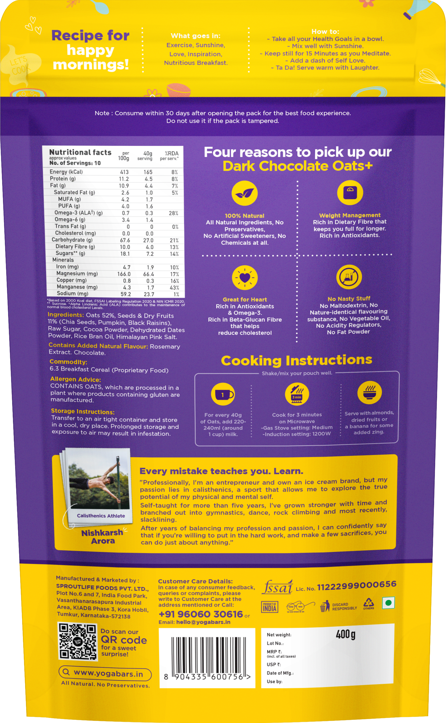 Yoga Bar Dark Chocolate Oats are yummy healthy oats coated with premium quality chocolate. These Australian Premium Golden Rolled Oats are certified and gluten-free. With only 5 minutes of preparation time, these super healthy oats will get your day started in the best way possible.