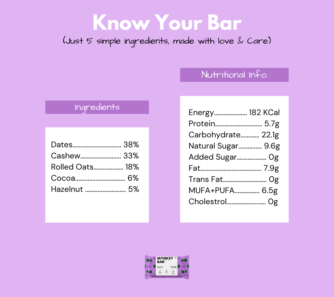 Big on Nutrition. Bigger on Taste. While searching for a perfect clean and healthy snack - We got inspiration by Maa's nagging to make us eat nuts and fruits. These bars are simple, pure and delicious made from just 4-6 natural ingredients with No added sugars, preservatives or additives and no monkey business.