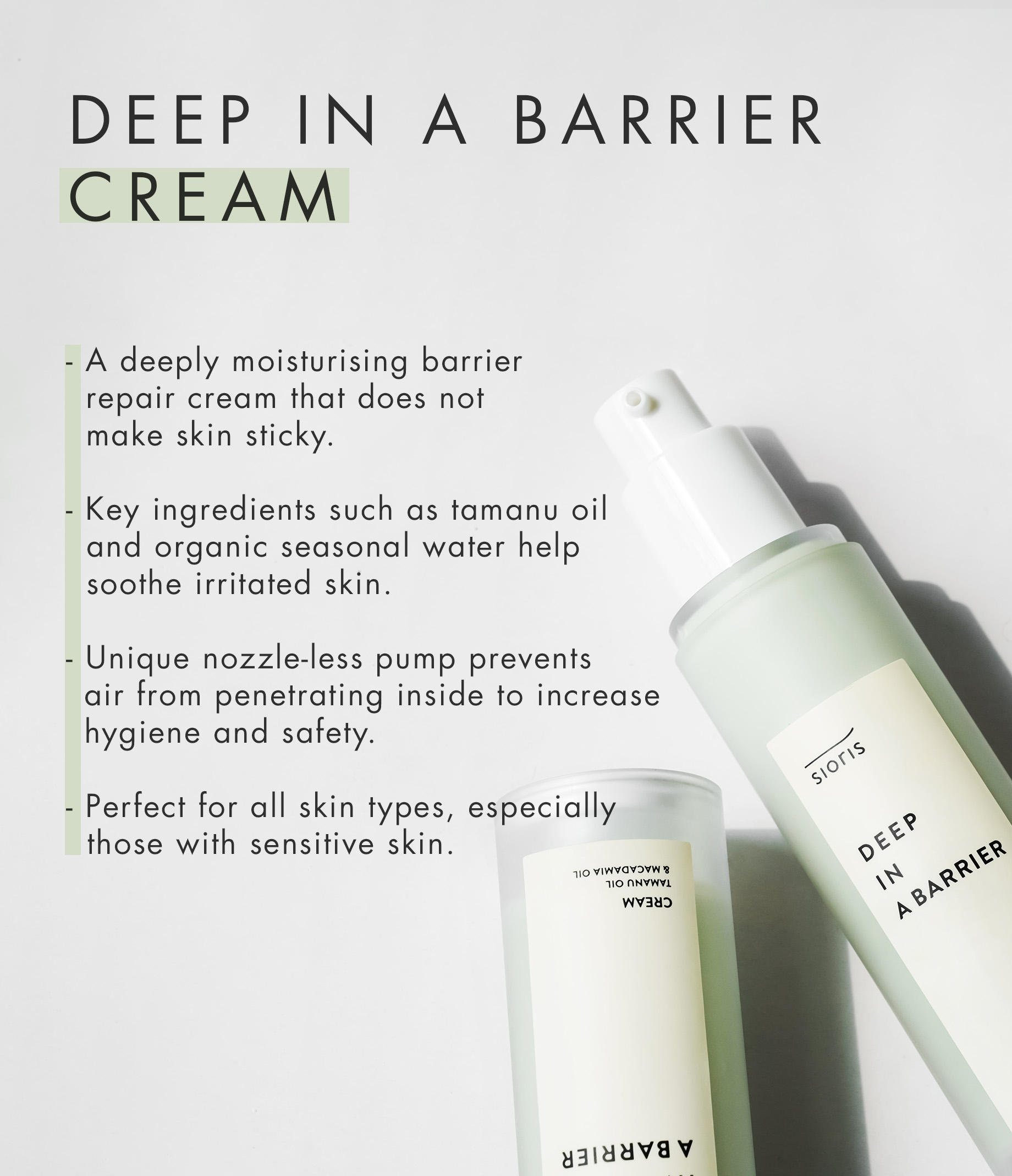 A deeply moisturising skin barrier repair cream that does not feel sticky. It uses key ingredients such as tamanu oil and organic citrus water to help, rejuvenate and hydrate dull or tired skin. It also uses green tea water and centella to help calm irritation. Its unique nozzle-less pump prevents air from penetrating inside to increase hygiene and safety. Cosmos Organic certified, and free of artificial additives the cream is especially suitable for sensitive skin.