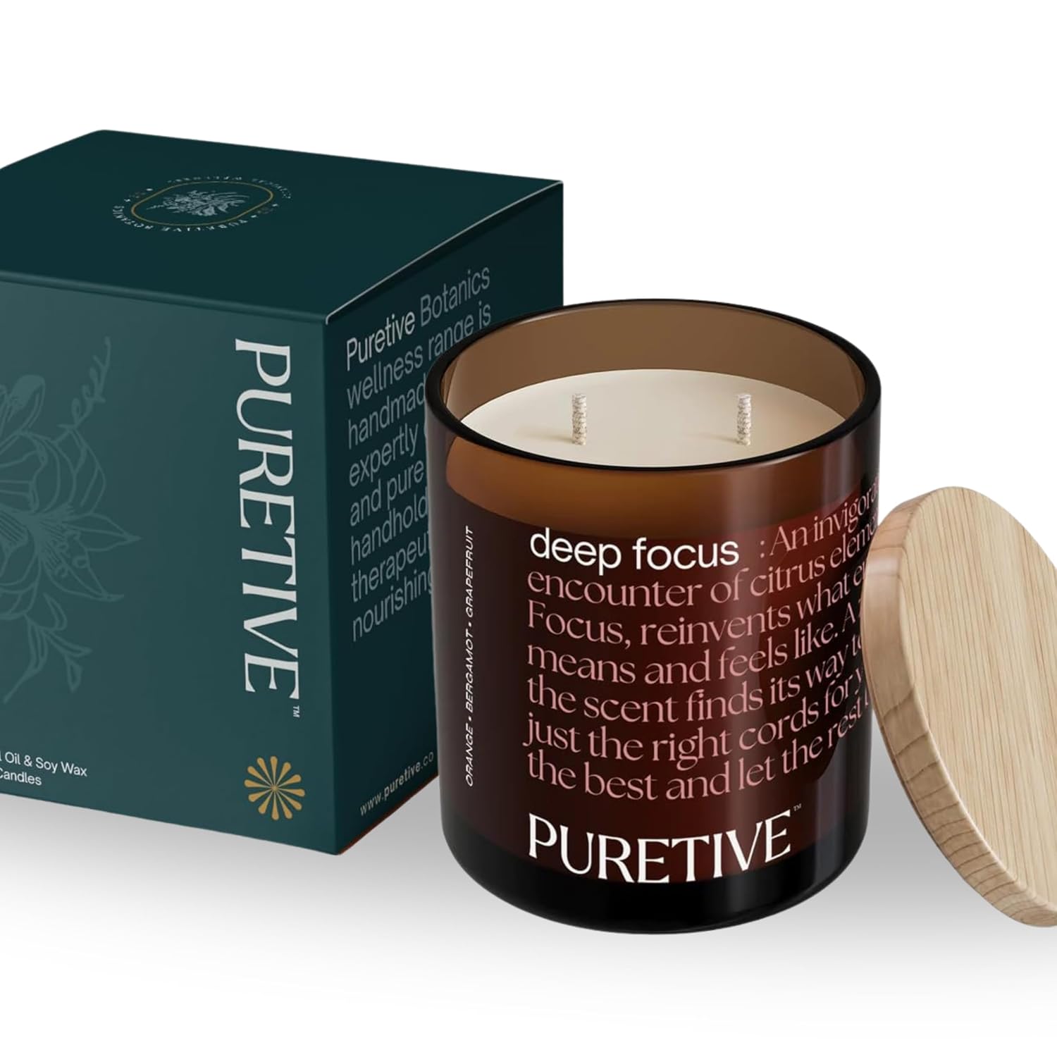 Enhance concentration and productivity with the Puretives DeepFocus Candle! Crafted with 100% pure soy wax, this scented candle offers a clean and eco-friendly burn, ensuring a toxin-free experience for you and your loved ones, making it perfect for gifting. Infused with a blend of Orange, Bergamot, and Grapefruit essential oils, known for their invigorating properties, this aromatherapy candle promotes mental clarity, focus, and concentration. The gentle flicker of the candle's flame combined with the uplifting aroma of essential oils creates a stimulating ambiance ideal for boosting concentration and productivity. Incorporate the Puretives DeepFocus candle for focus into your workspace or study area to help sharpen focus and enhance mental alertness, allowing you to tackle tasks with clarity and efficiency. Before lighting the candle, set an intention for your focus session, visualizing your goals and affirming your commitment to staying present and attentive. The combination of these essential oils supports cognitive function and mental acuity, making it easier to retain information and solve problems effectively. Light the Puretives DeepFocus candle for decor whenever you need a boost in concentration, whether you're working on a project, studying for an exam, or engaging in creative endeavors. Perfect for scented candles for home and candles for gift, experience the power of mental clarity and focus with the Puretives DeepFocus candle. This versatile candle also serves as an ideal choice for stress relief candles aromatherapy and candles for aroma, adding a refreshing touch to any setting.