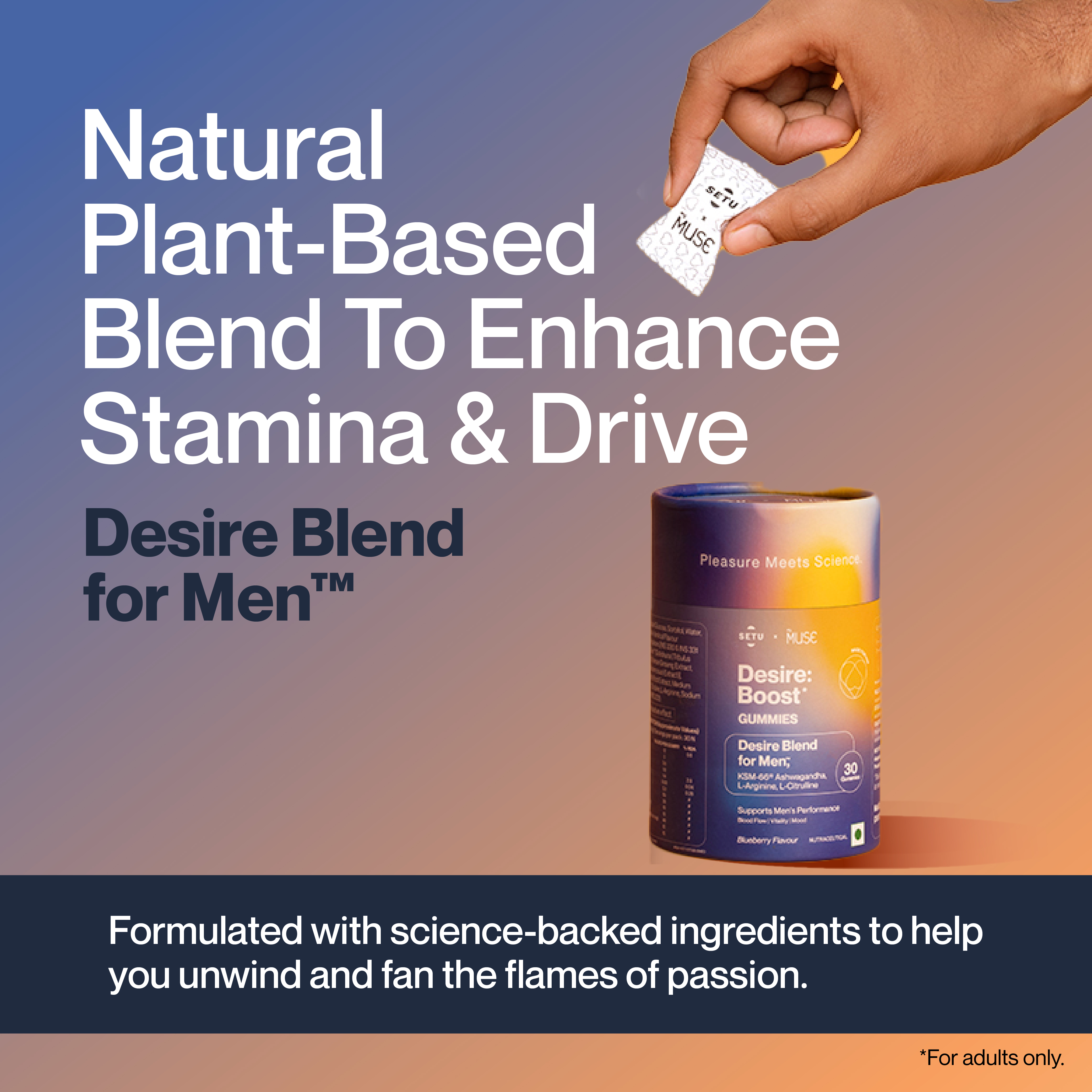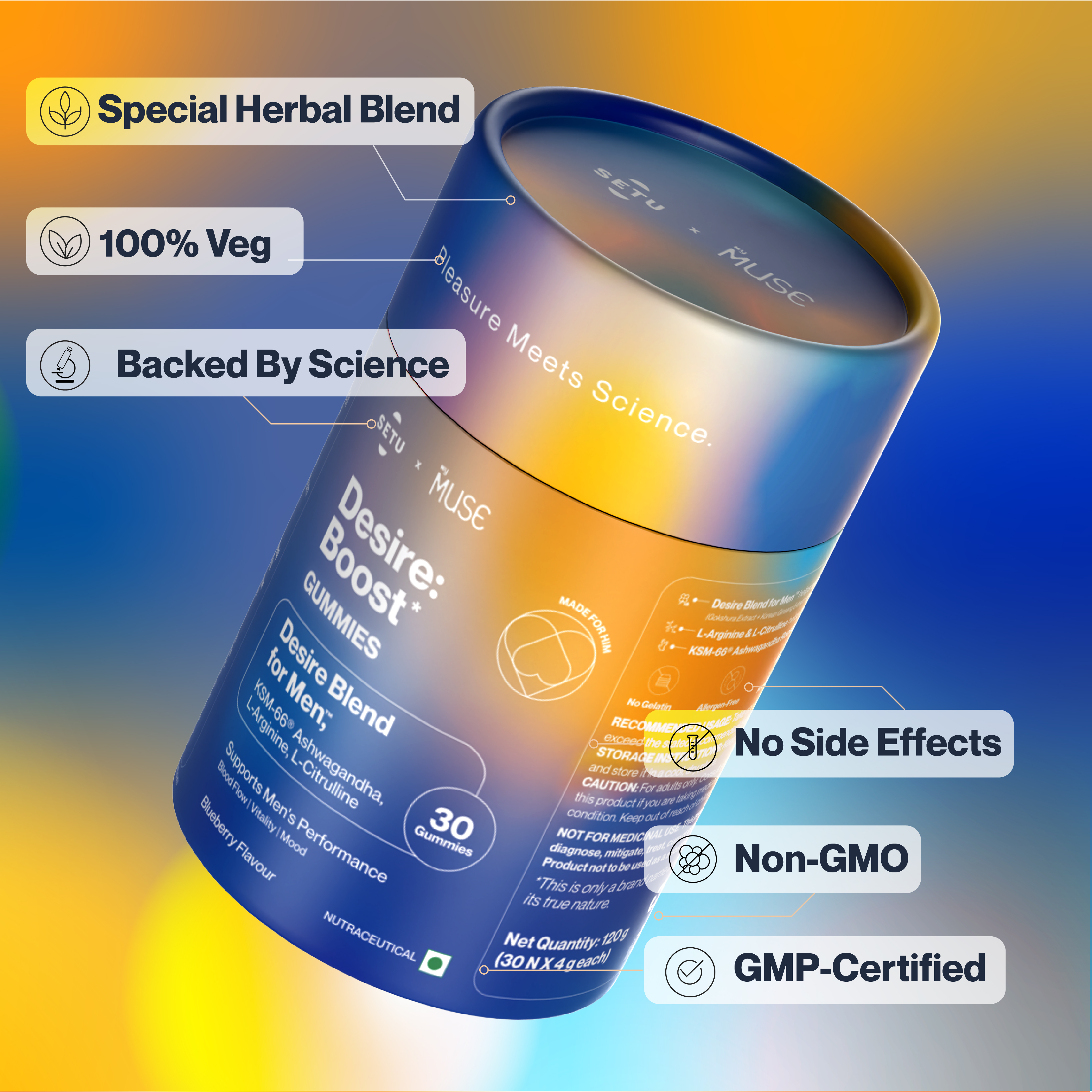 Setu Nutrition X MyMuse Desire: Boost Gummies for Men is enriched with a blend of 6+ clinically-proven ingredients that act as a natural testosterone booster and help tackle modern-day challenges that affect performance and desire.