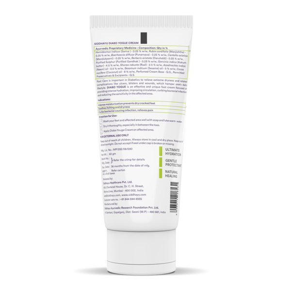 This product hydrates nourishes and softens dry, calloused, and infected feet. A blend of herbal extracts and natural oils, it is steroids free and well suited for diabetes foot care. It absorbs quickly and deeply to improve circulation. Coconut and sesame oil combine with kokum butter, moisturize and reduce sensitivity in the affected area. The neem oil and herbs curb bacterial infection and reduce pain.