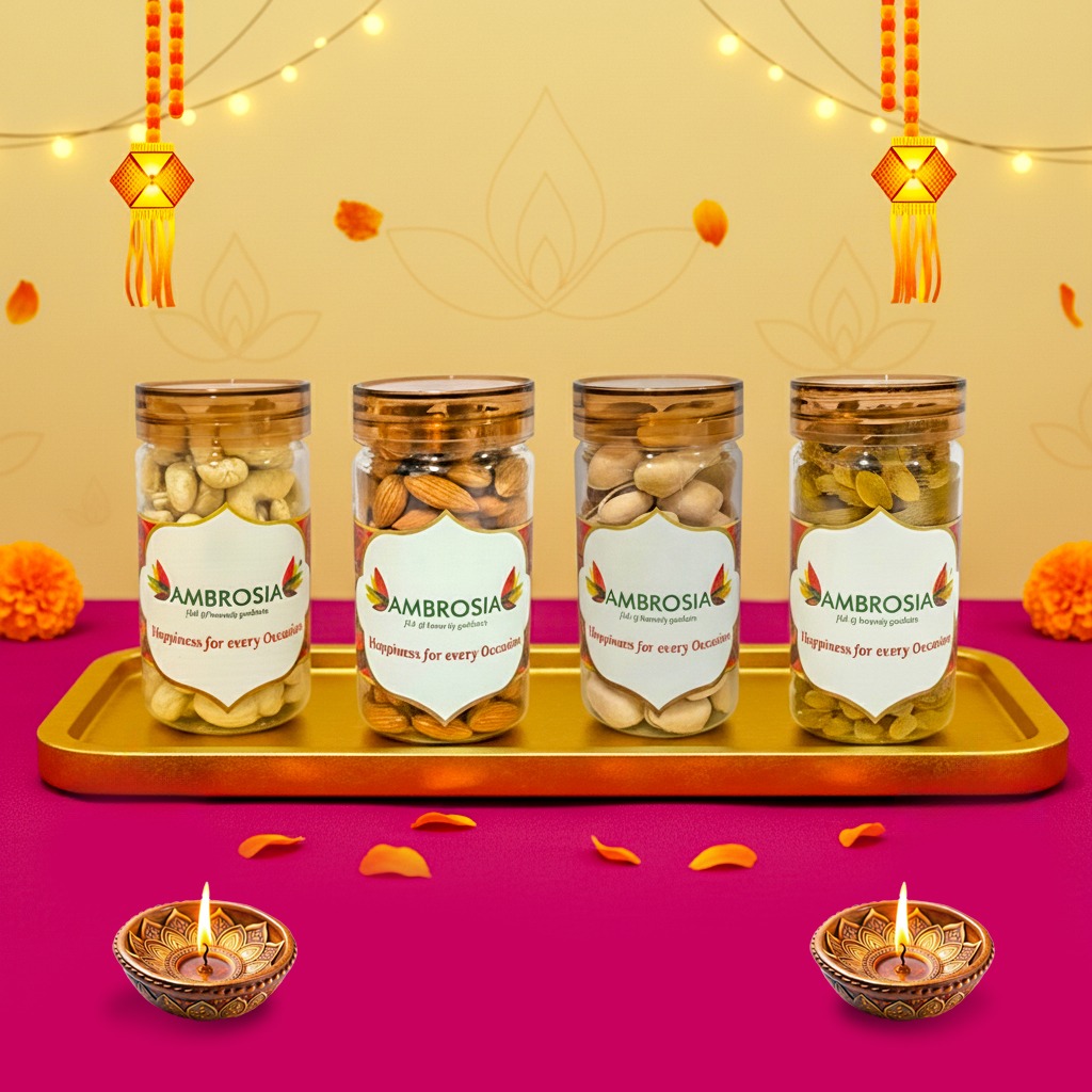 Celebrate the joy of Diwali with a premium assortment of Ambrosia Almonds, Cashews, Pistachios, and Raisins. Packed with health, taste, and tradition, this dry fruit collection makes the perfect gift for family, friends, and colleagues. A thoughtful way to wish prosperity, wellness, and happiness this festive season. Perfect for corporate gifting, festive celebrations, and sharing moments of joy.