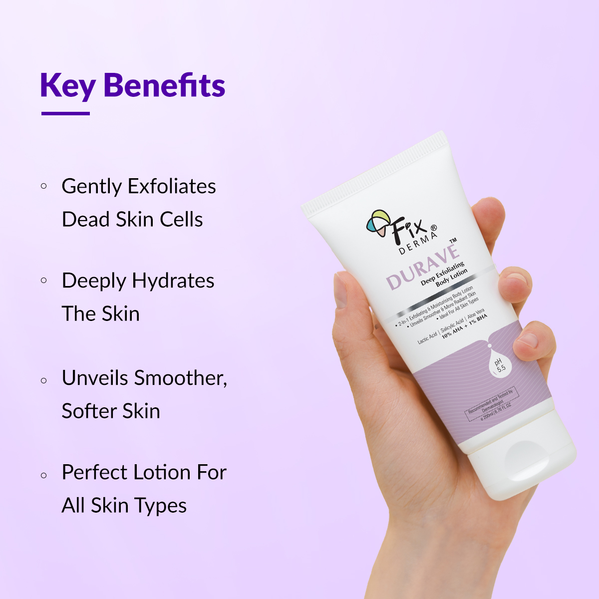 Fixderma durave deep exfoliating body lotion is an ideal formulation that removes dead skin cells and promotes cell renewal. With its exfoliating and hydrating properties, it specializes in smoothening rough, bumpy, and scaly skin. This advanced formula also replenishes the skin and provides intense hydration, leading to soft and supple skin. With regular usage, it also helps in diminishing dark spots and blemishes, leading to even skin tone.