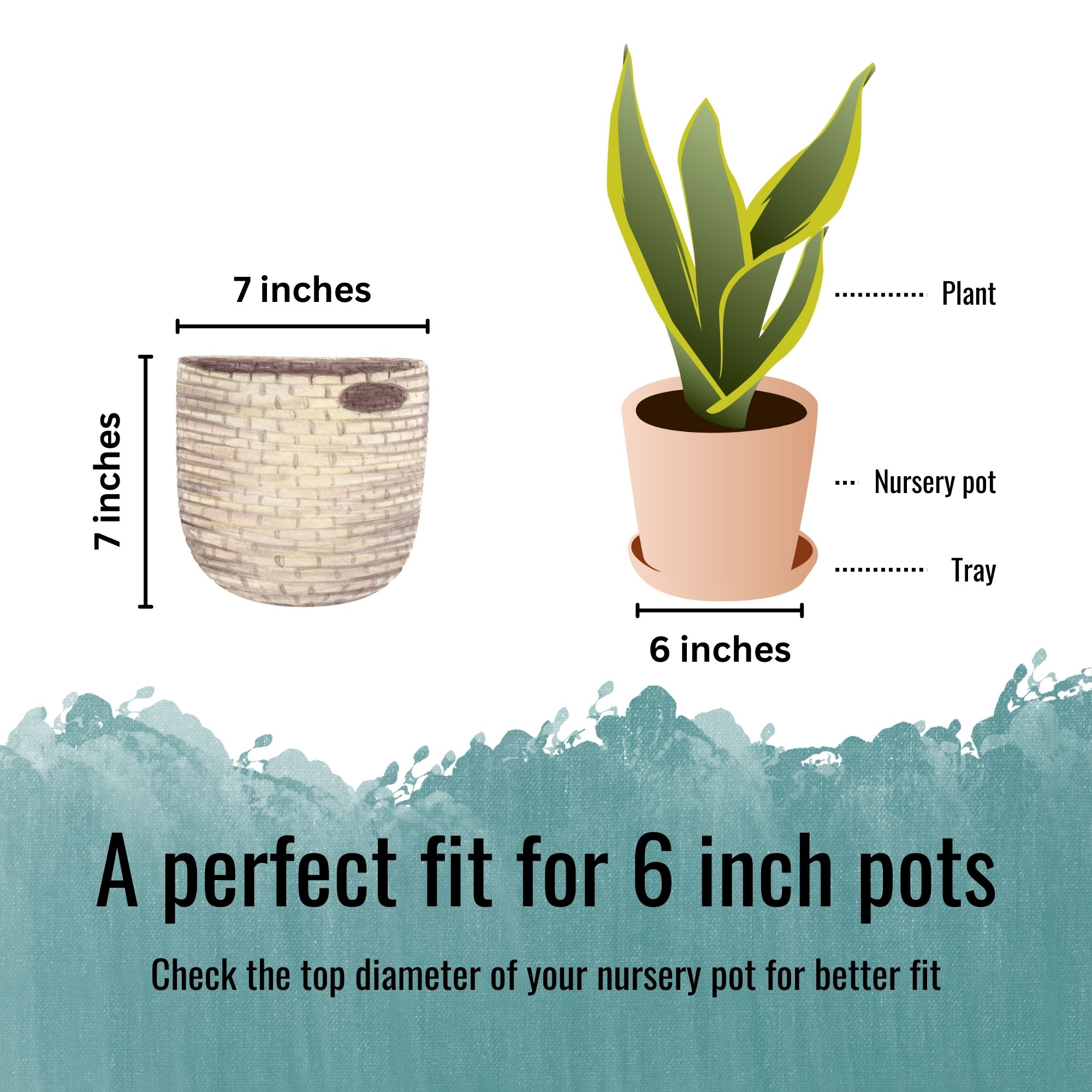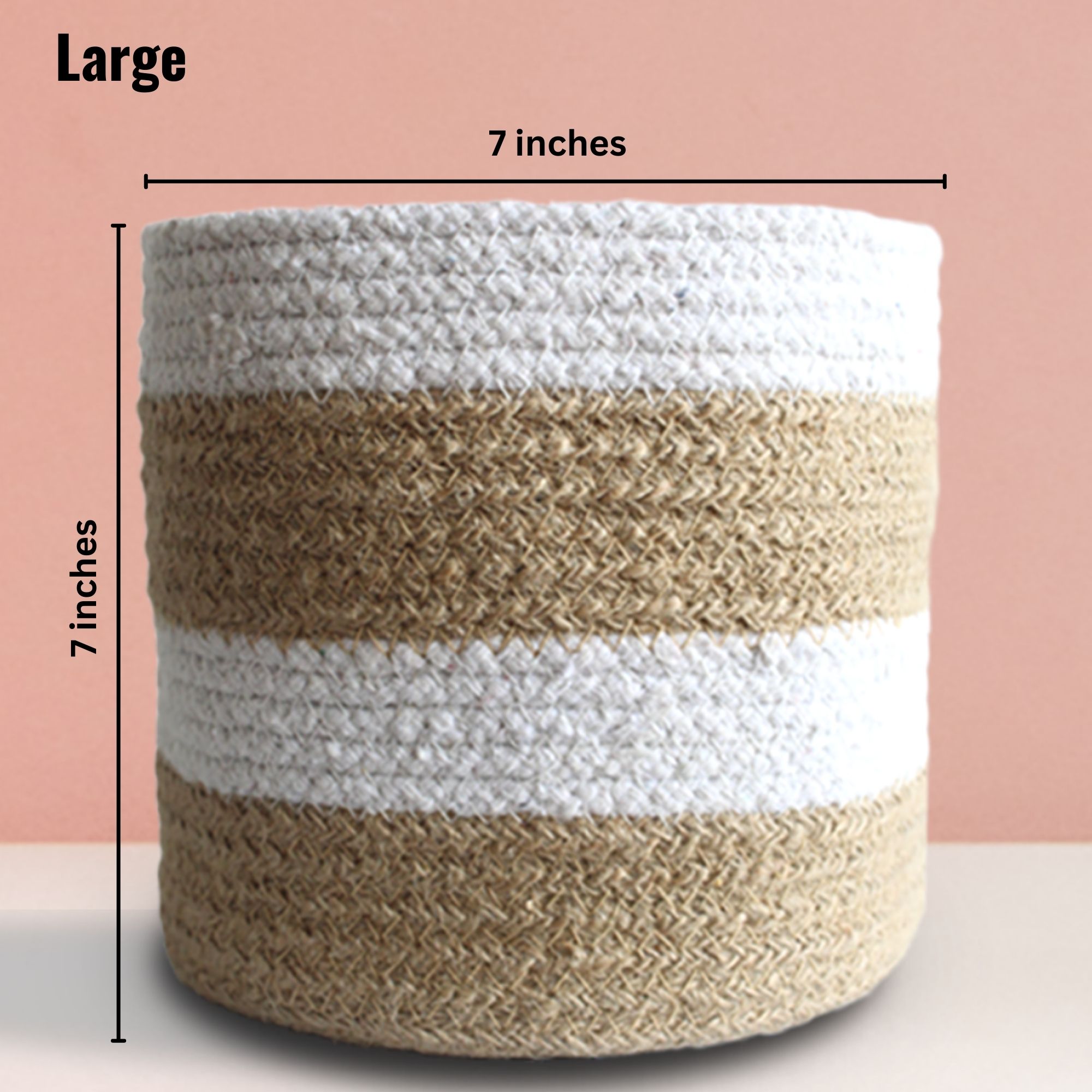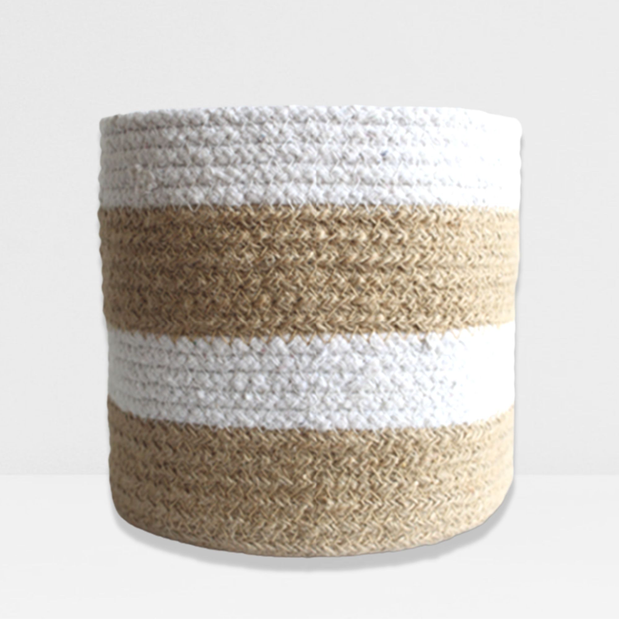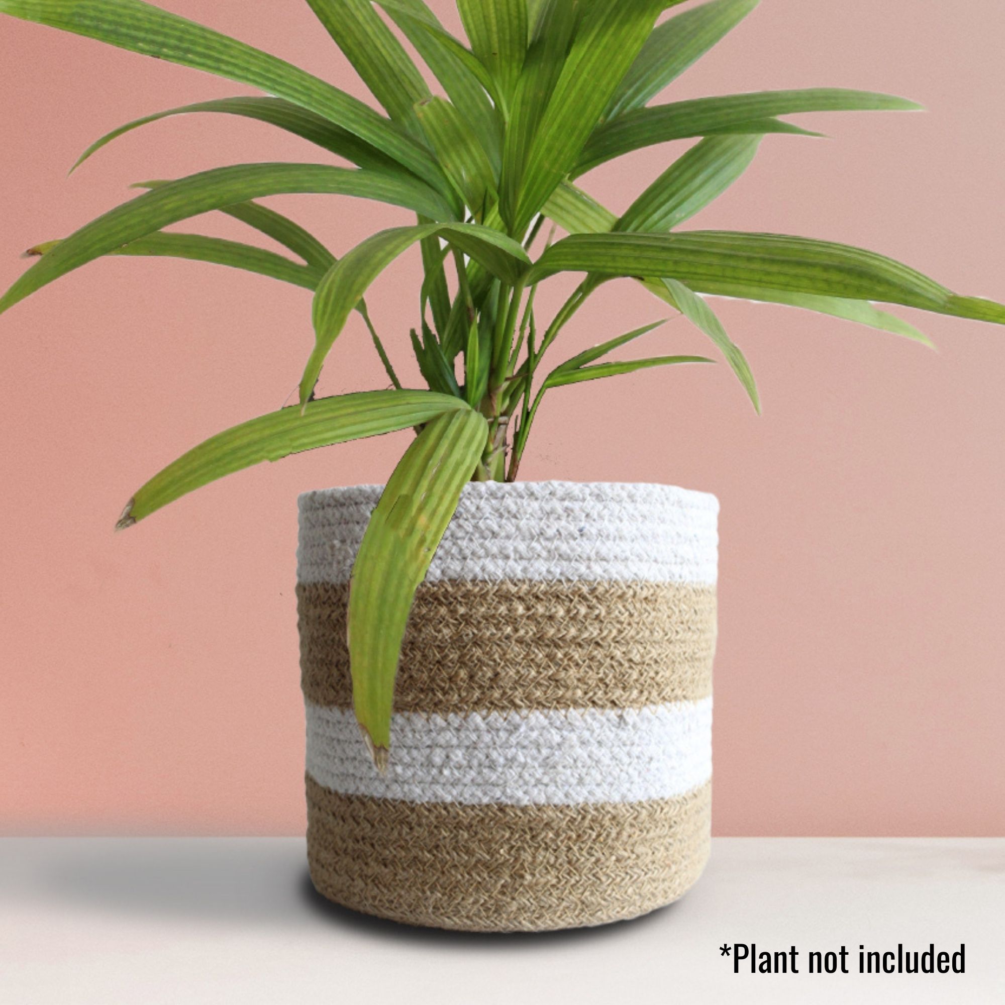 An eco-friendly planter made from jute and is a beautiful one. It comes in a striped pattern with White & Jute Brown color. The planter is approximately 7 inches in diameter. Greenkin's jute planters are made in India and handcrafted by skilled artisans of our country. They are washable and repurposable. They make a beautiful & modern addition to a space.