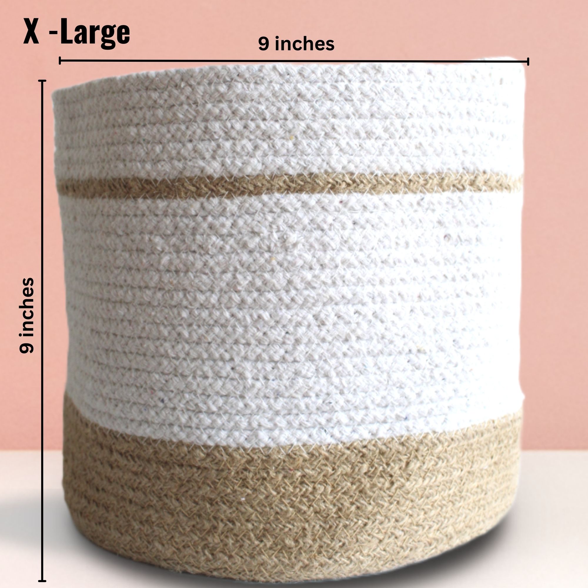 An eco-friendly planter made from jute and is a beautiful one. It comes in a stylish pattern and a White color with a Jute Brown colored base. The planter is approximately 9 inches in diameter. Greenkin's jute planters are made in India and handcrafted by skilled artisans of our country. They are washable and repurposable. They make a beautiful & modern addition to a space.