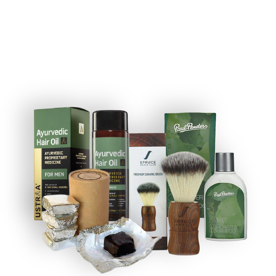 Encased within Essential Skin Care and Healthy Snacks Gift Box consists of Huda Bar - Cashew Butter Nutjobs (Pack of 5), Ustraa - Ayurvedic Hair Oil (200 ml), Spruce Shave Club -Wood Shaving Brush (1 Unit) and Paul Penders - Men's Best Shower & Shampoo for nourished scalp - 125 ml.